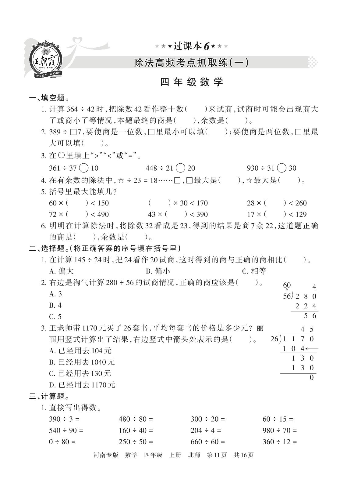 王朝霞期末过课本——除法高频考点抓取练(一)四年级上册数学(北师版)_R211225093136558【6】