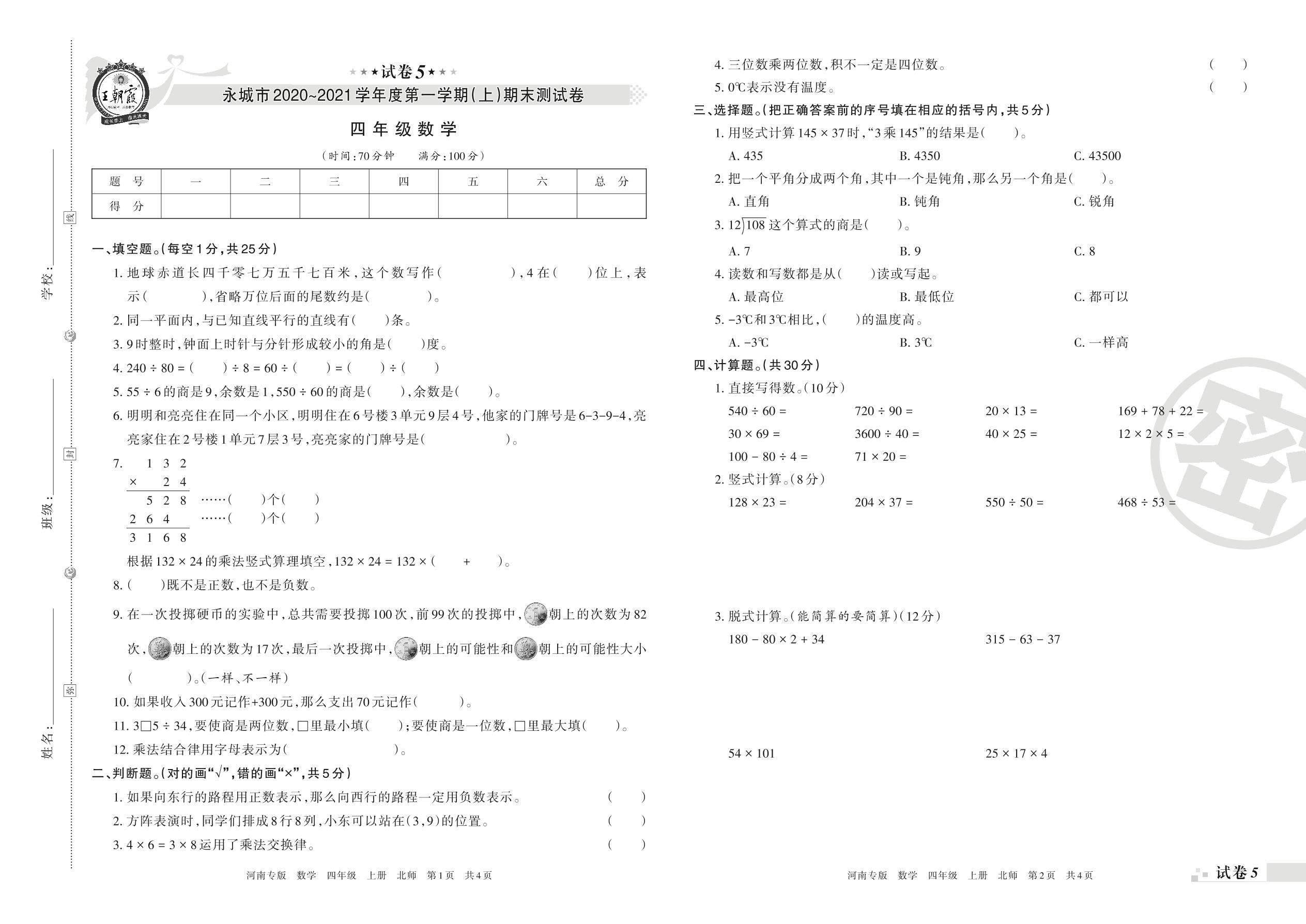 永城市2020~2021学年度第一学期(上)期末测试卷四年级数学(北师版)【5】
