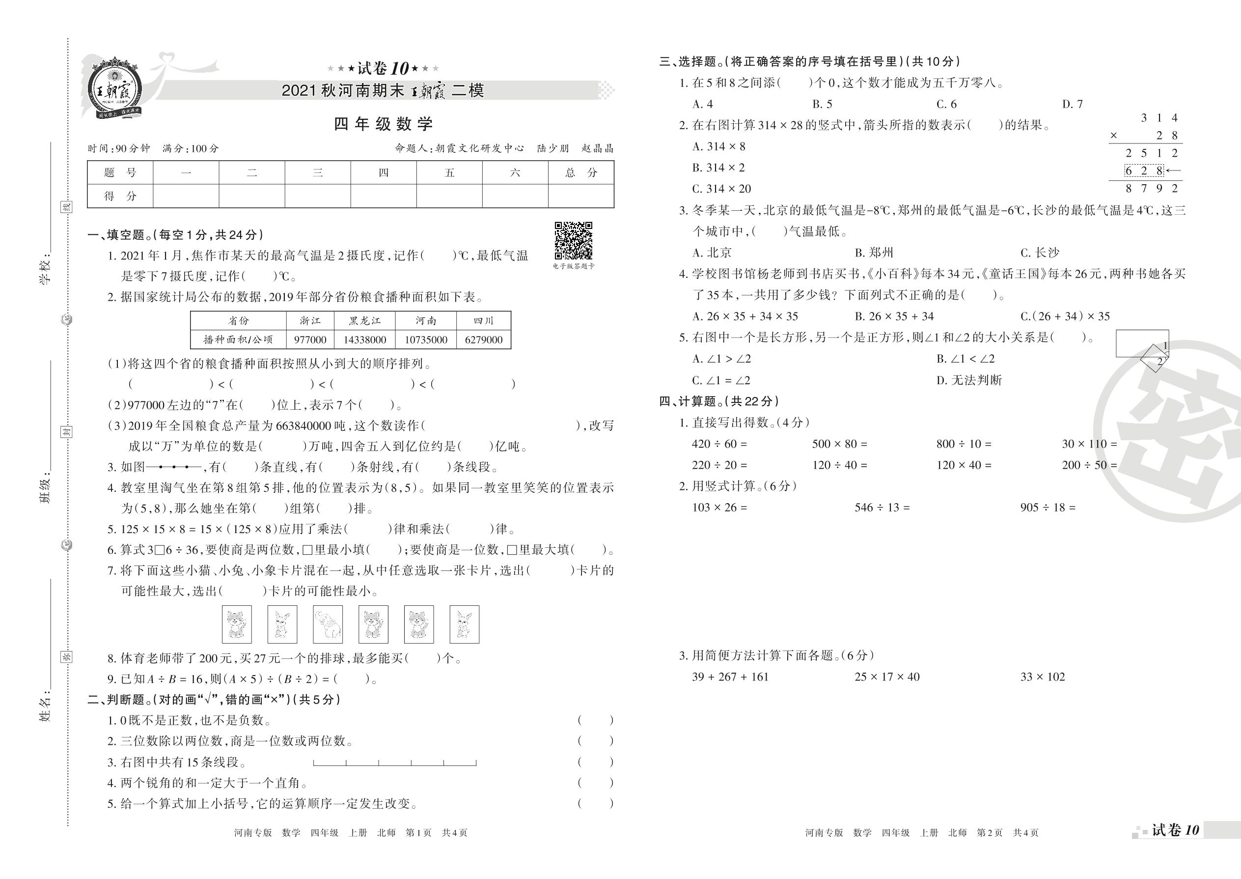 王朝霞期末模拟卷四年级上册数学(北师版)【10】