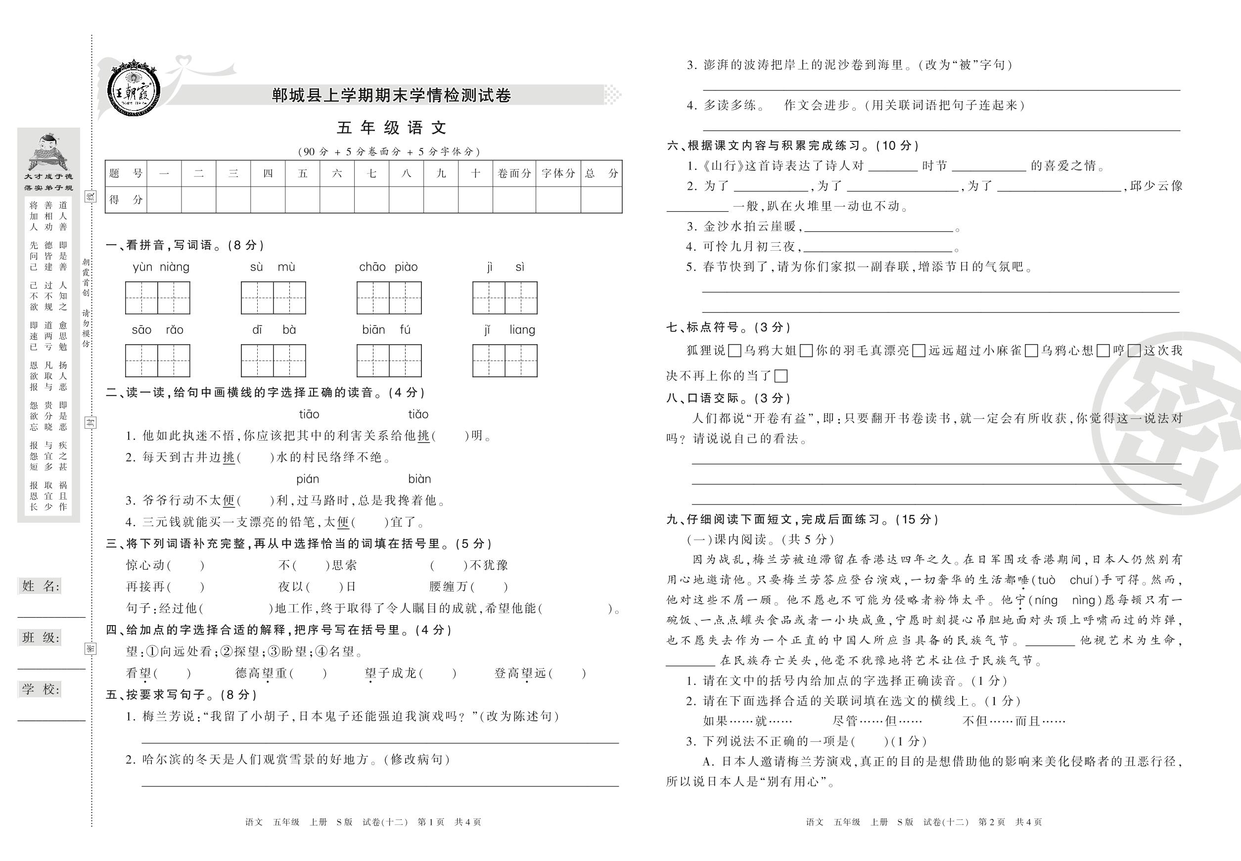 2016-2017学年第一学期周口市郸城县五年级语文试卷(S版)【12】