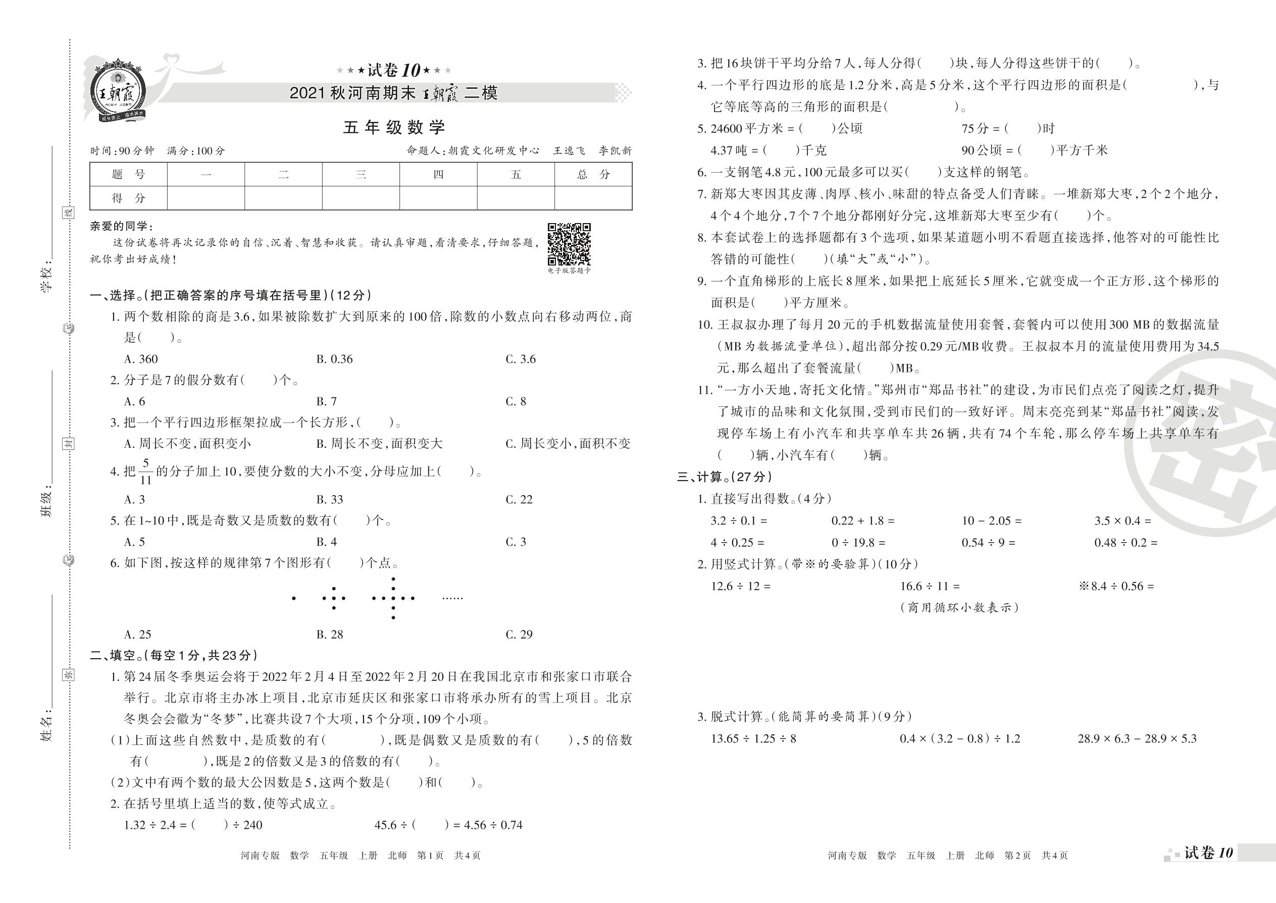 王朝霞期末模拟卷五年级上册数学(北师版)【10】