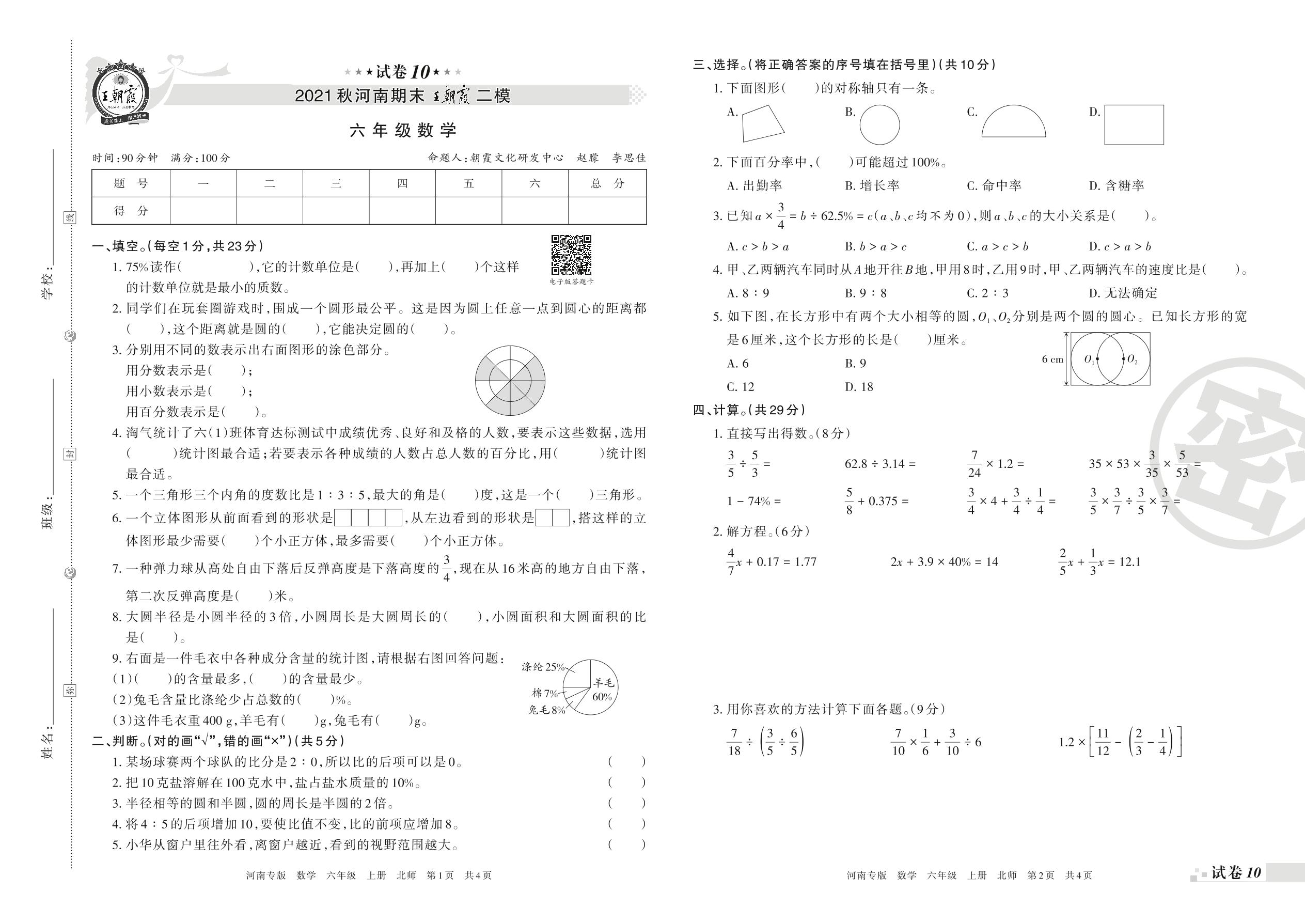 王朝霞期末模拟卷六年级上册数学(北师版)【10】