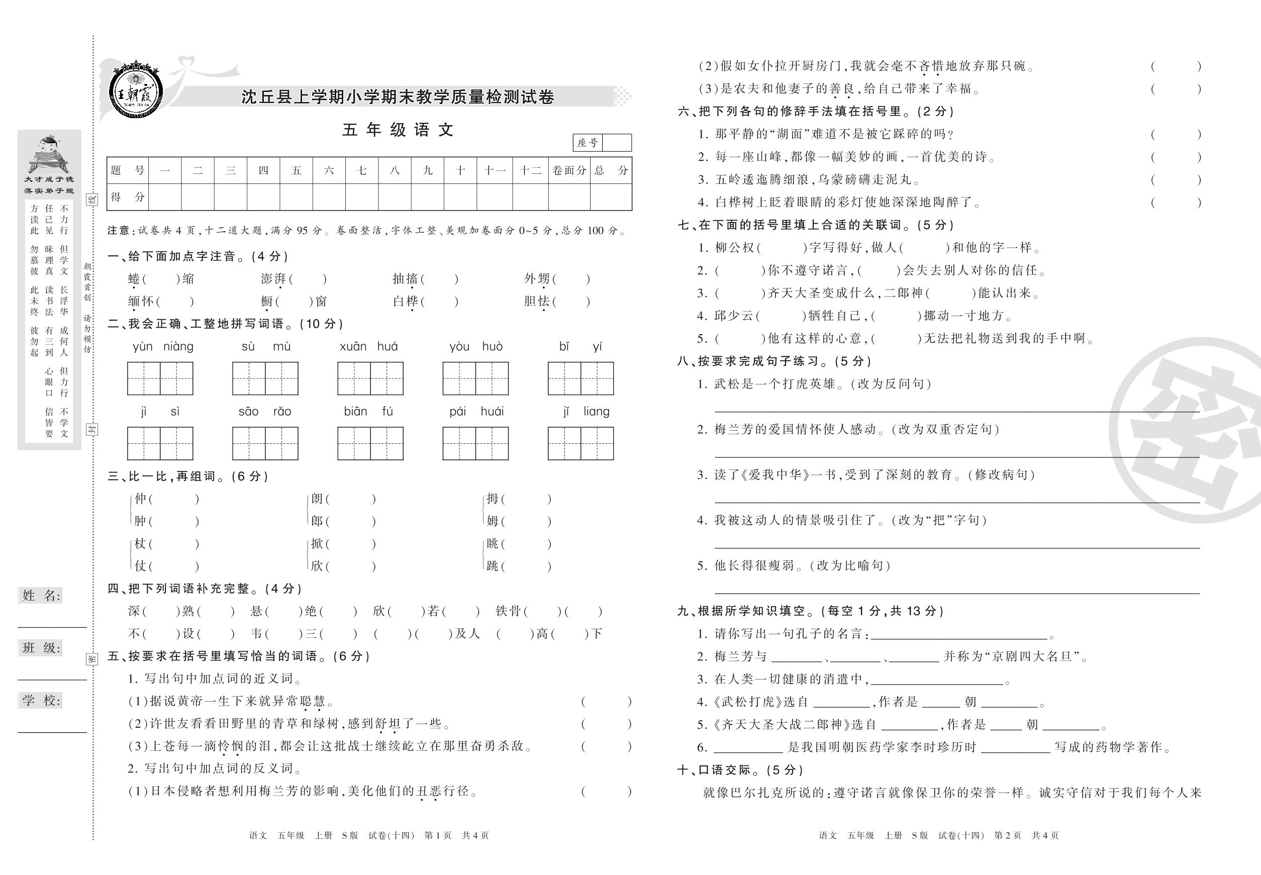 2016-2017学年第一学期周口市沈丘县五年级语文试卷(S版)【14】
