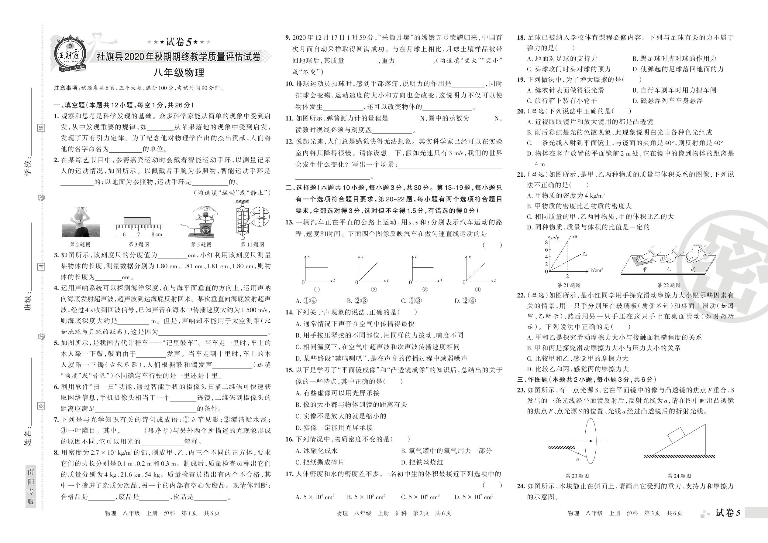 社旗县2020年秋期期终教学质量评估试卷八年级物理(沪科版)【5】