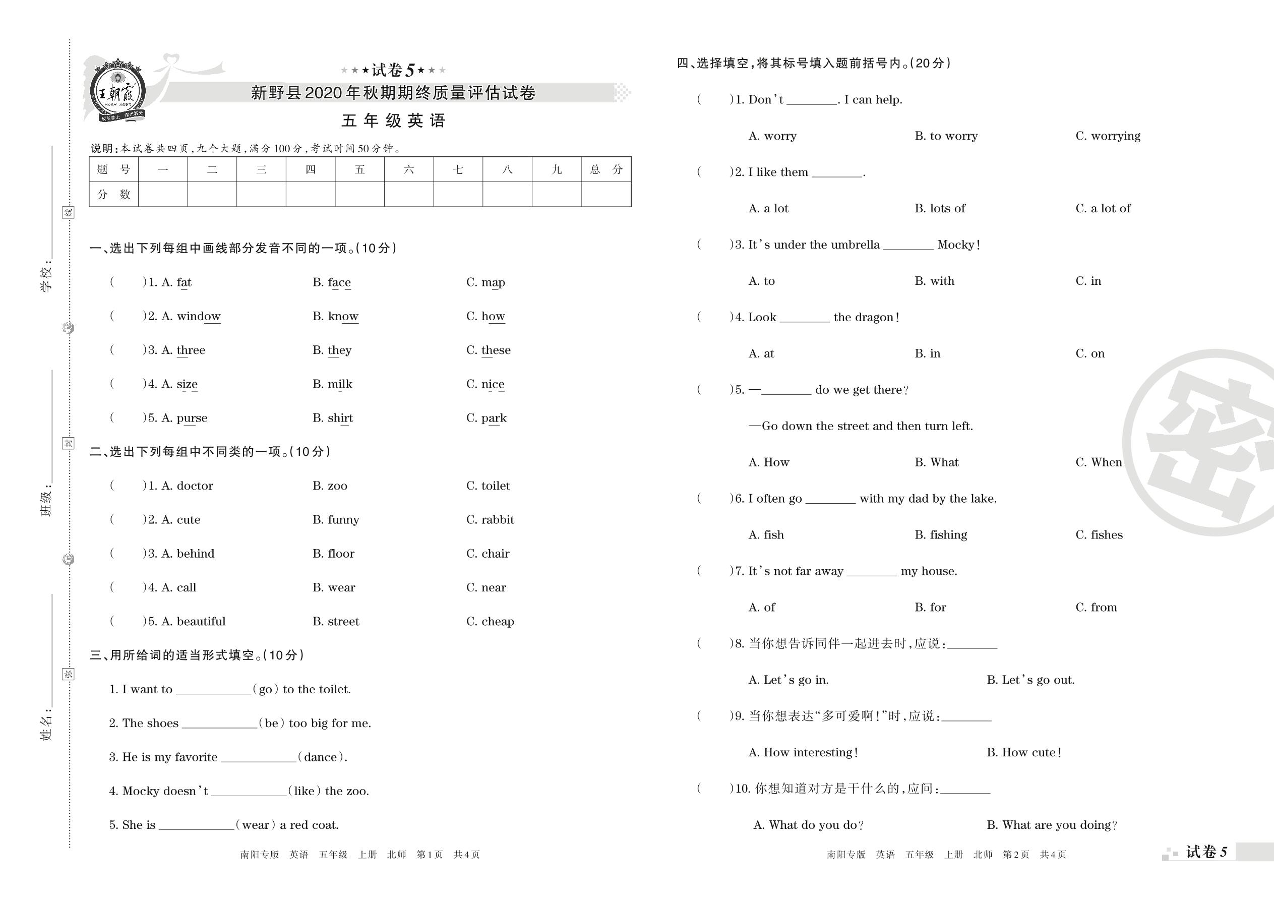 新野县2020年秋期期终质量评估试卷五年级英语(北师版)【5】