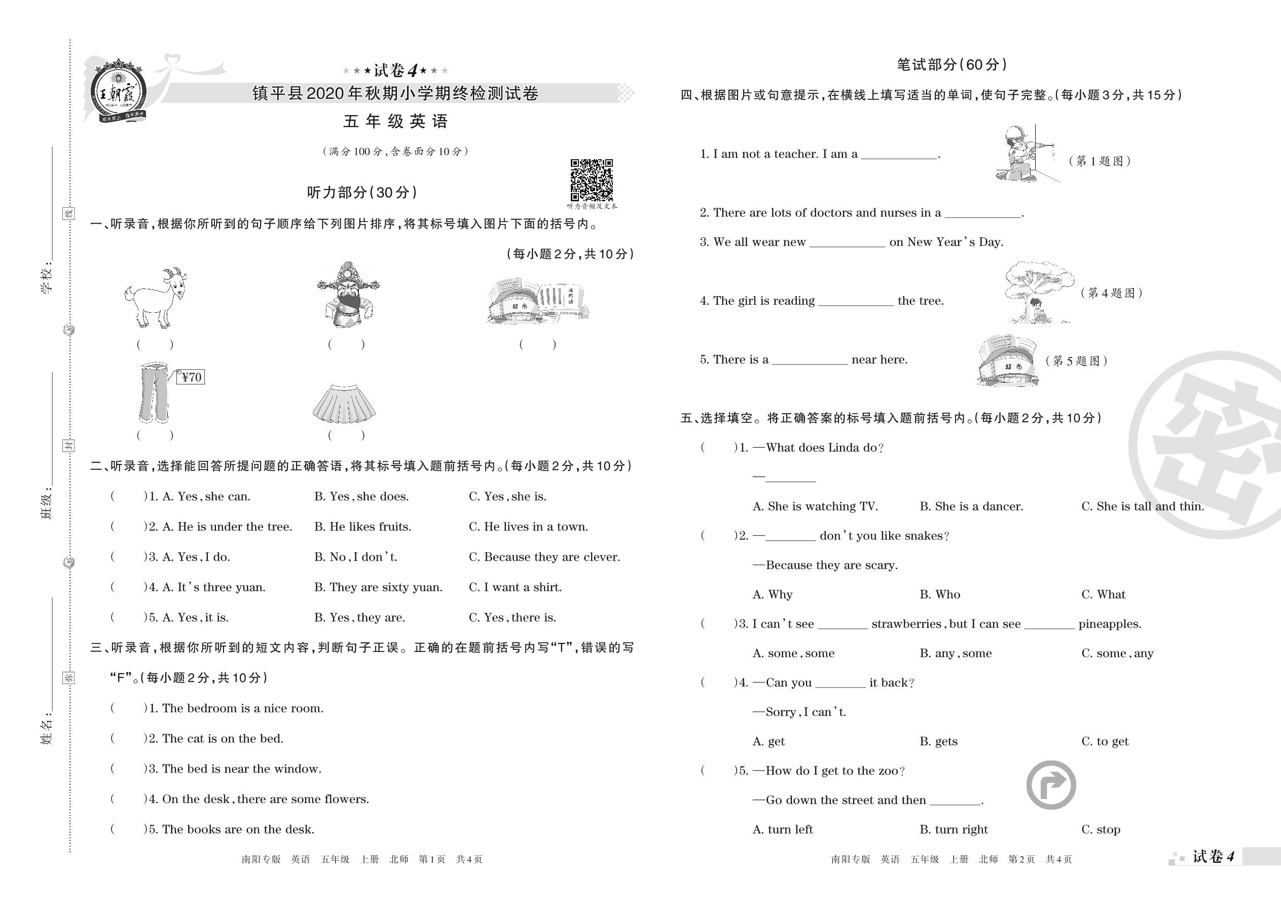 镇平县2020年秋期小学期终检测试卷五年级英语(北师版)【4】
