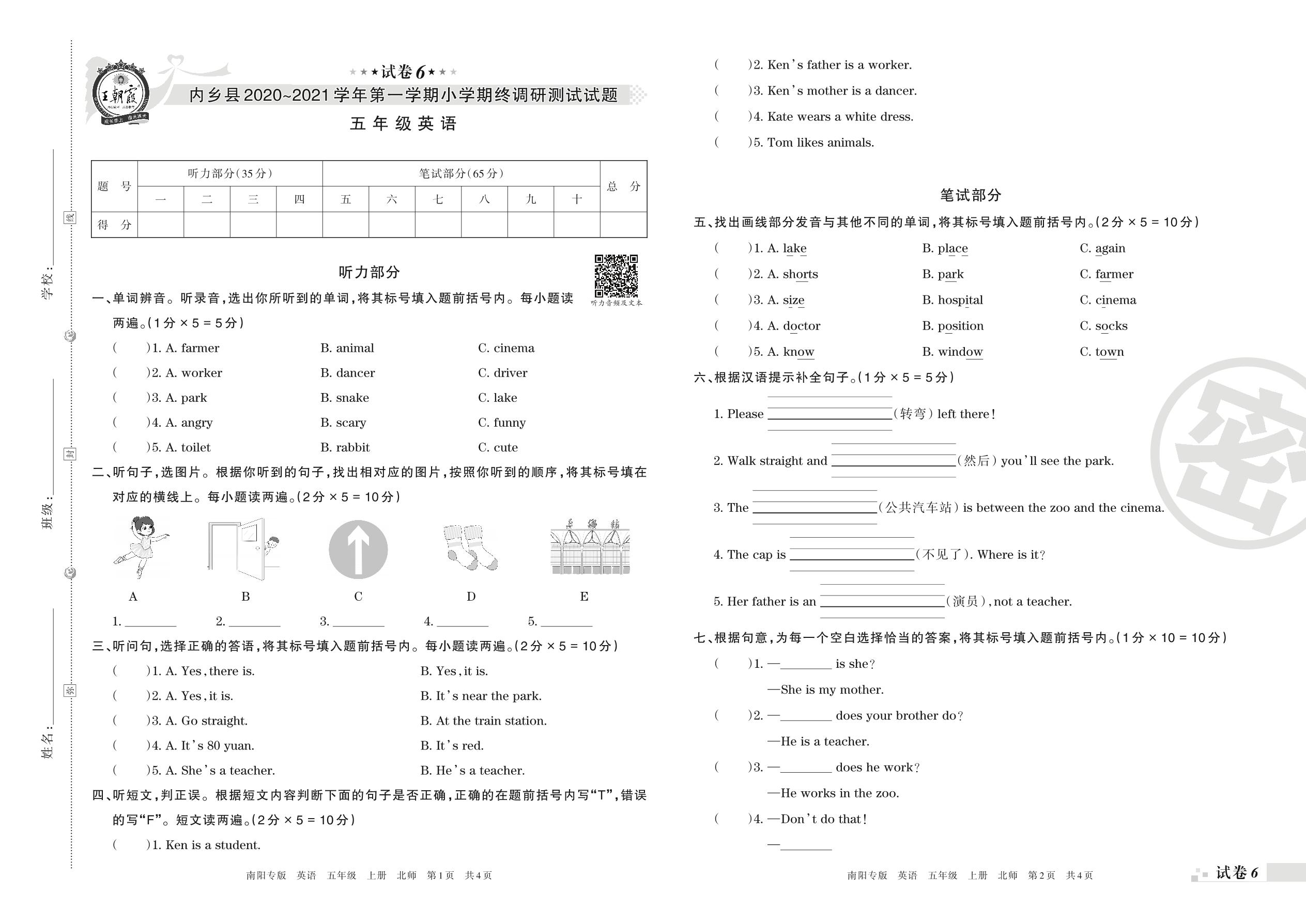 内乡县2020~2021学年第一学期小学期终调研测试试题五年级英语(北师版)【6】