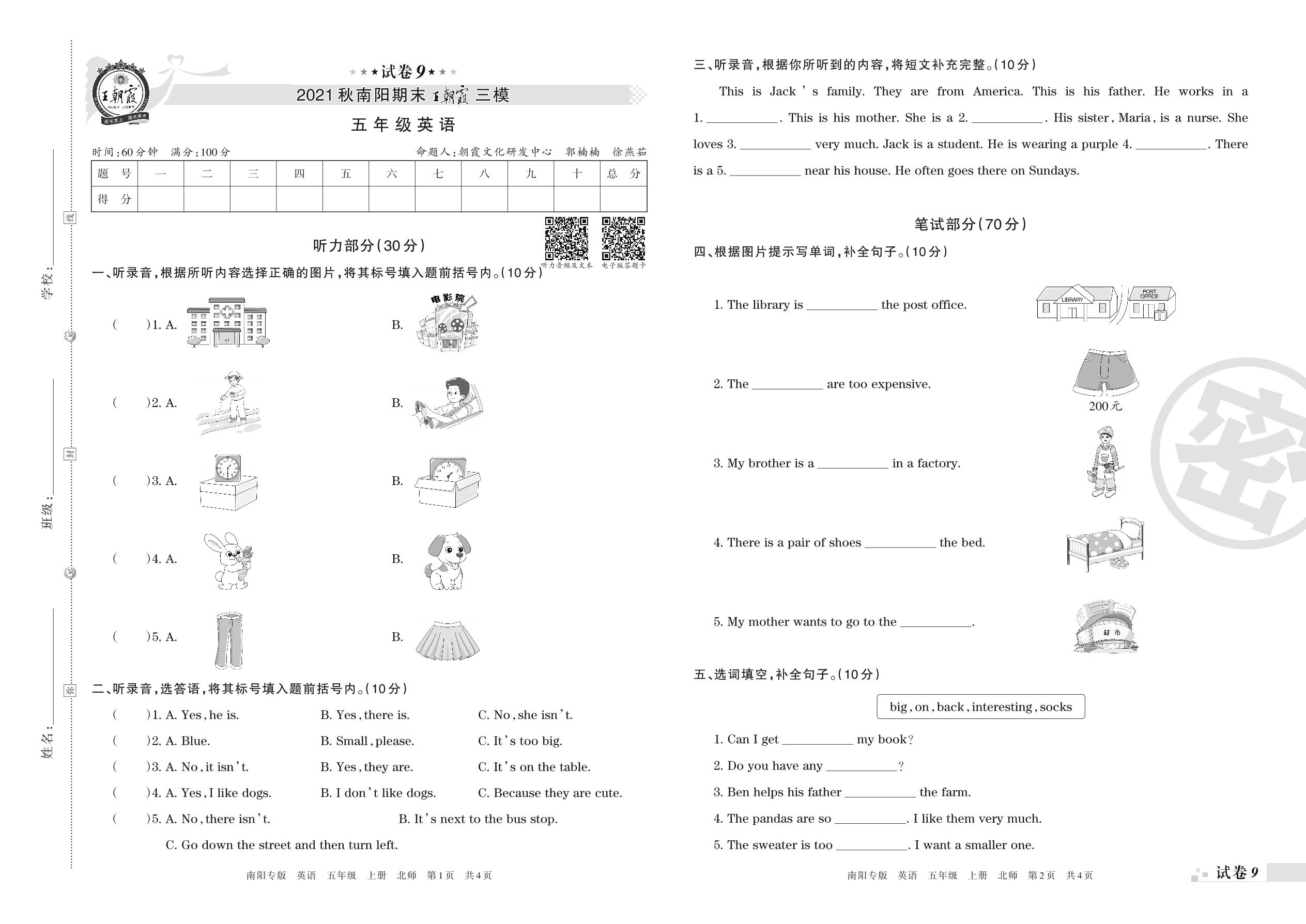 王朝霞期末模拟卷五年级上册英语(北师版)【9】