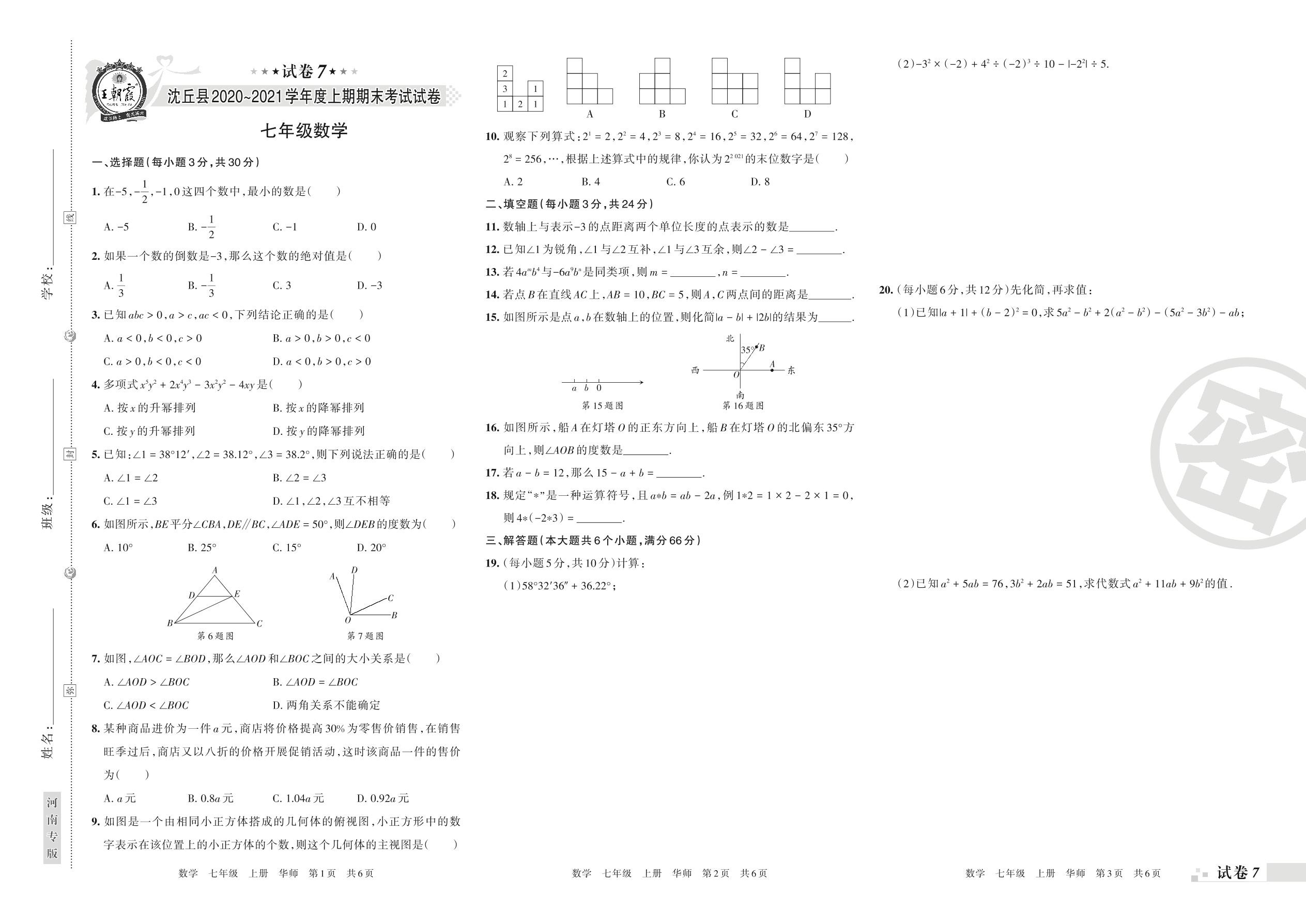 沈丘县2020~2021学年度上期期末考试试卷七年级数学(华师版)【7】