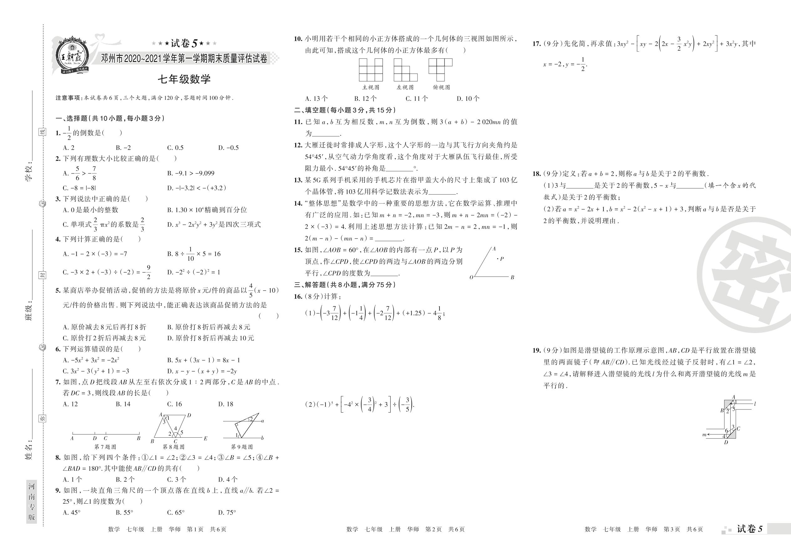 邓州市2020~2021学年第一学期期末质量评估试卷七年级数学(华师版)【5】