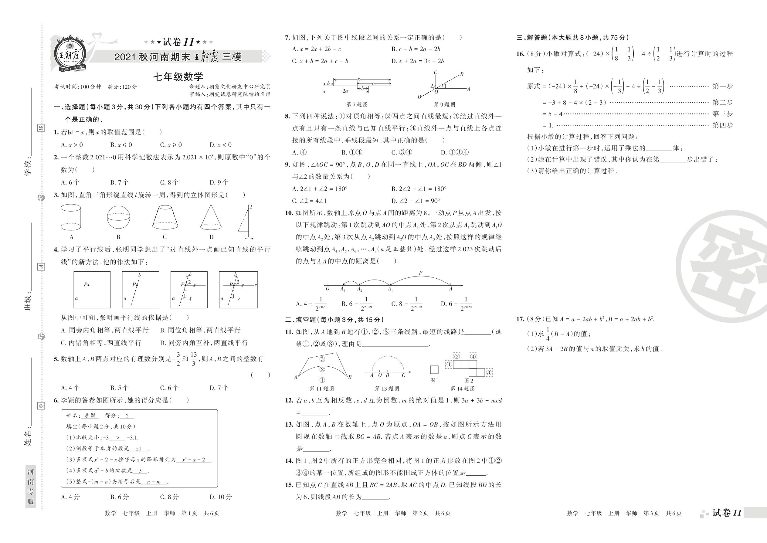 王朝霞期末模拟卷七年级上册数学(华师版)_R211225100215507【11】