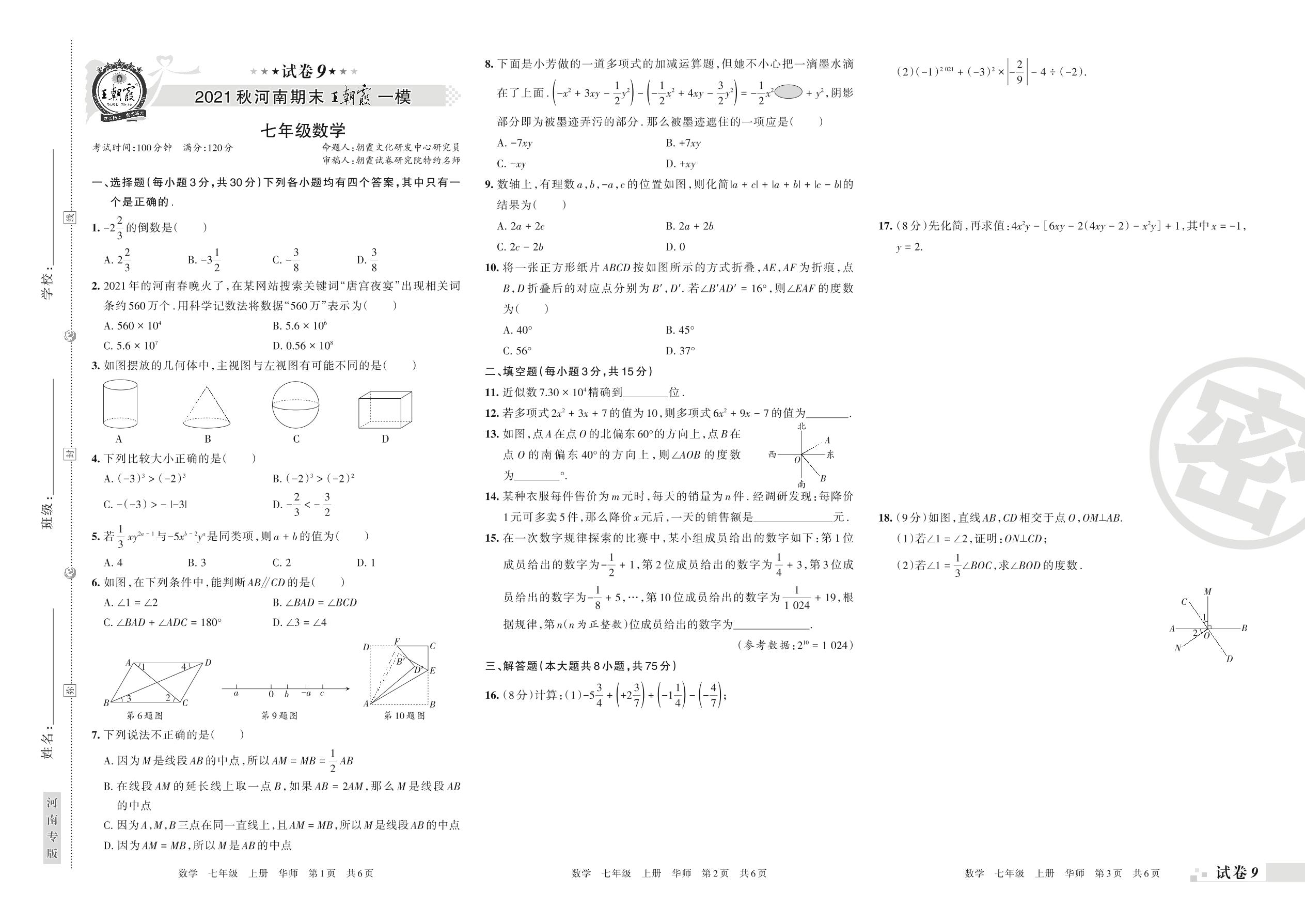 王朝霞期末模拟卷七年级上册数学(华师版)_R211225100215091【9】
