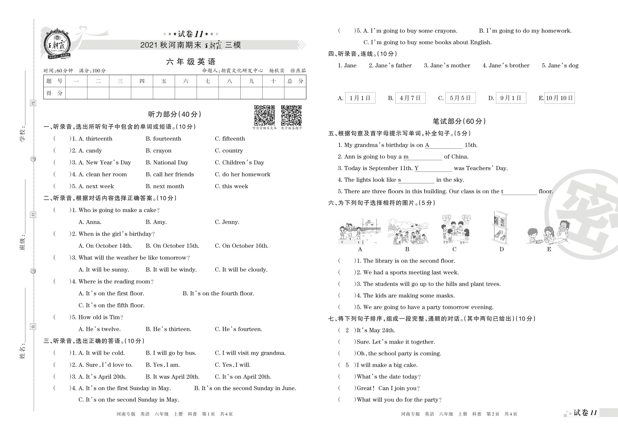 王朝霞期末模拟卷六年级上册英语(科普版)【11】