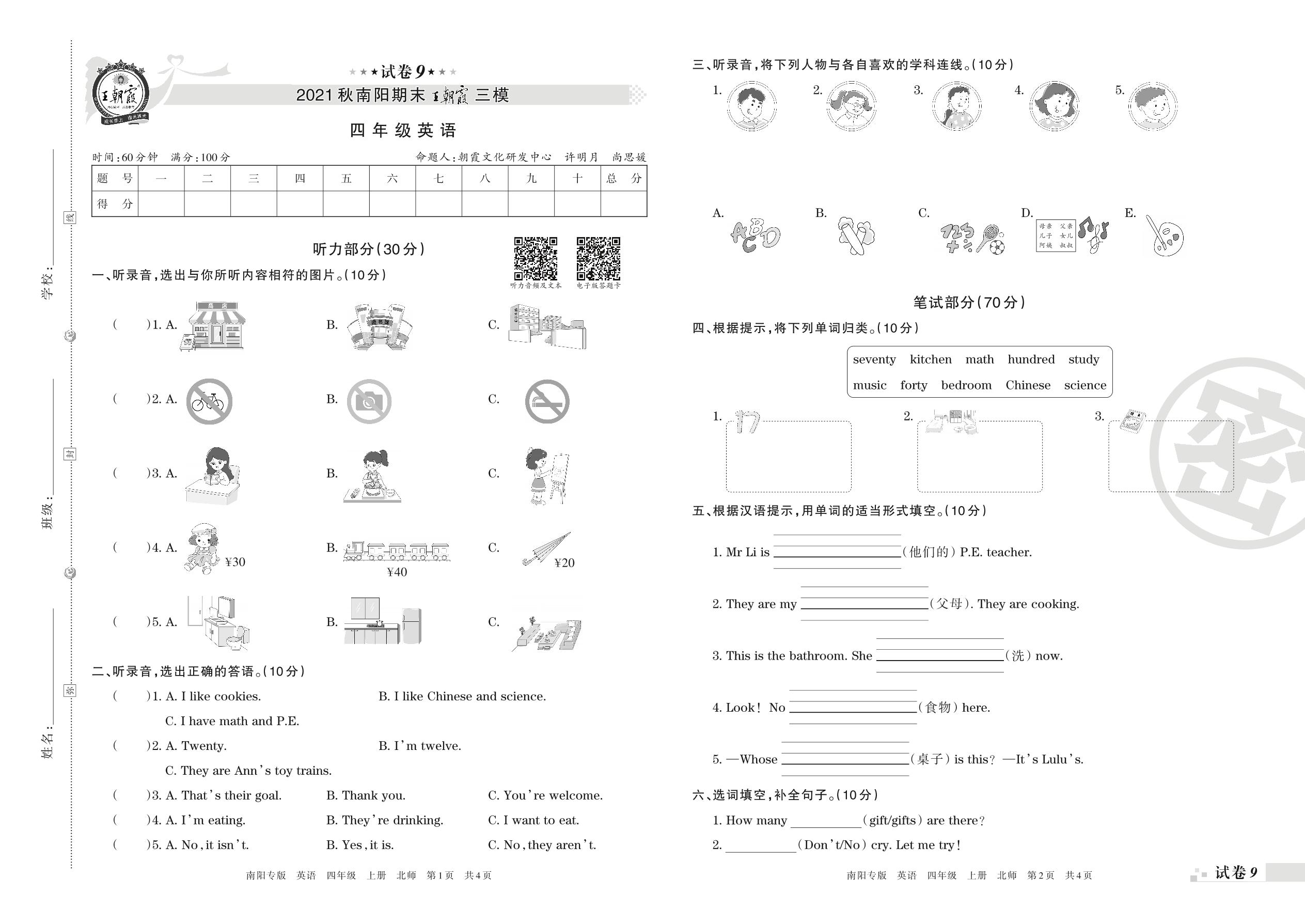 王朝霞期末模拟卷四年级上册英语(北师版)【9】