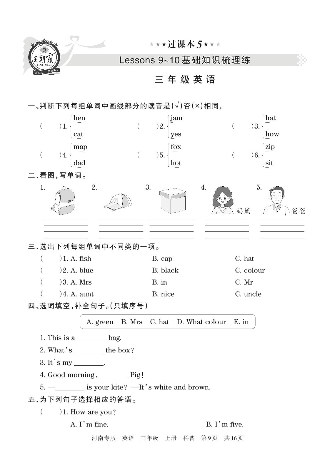 王朝霞期末过课本——Lessons 9~10基础知识梳理练三年级上册英语(科普版)_R211225102054996【5】