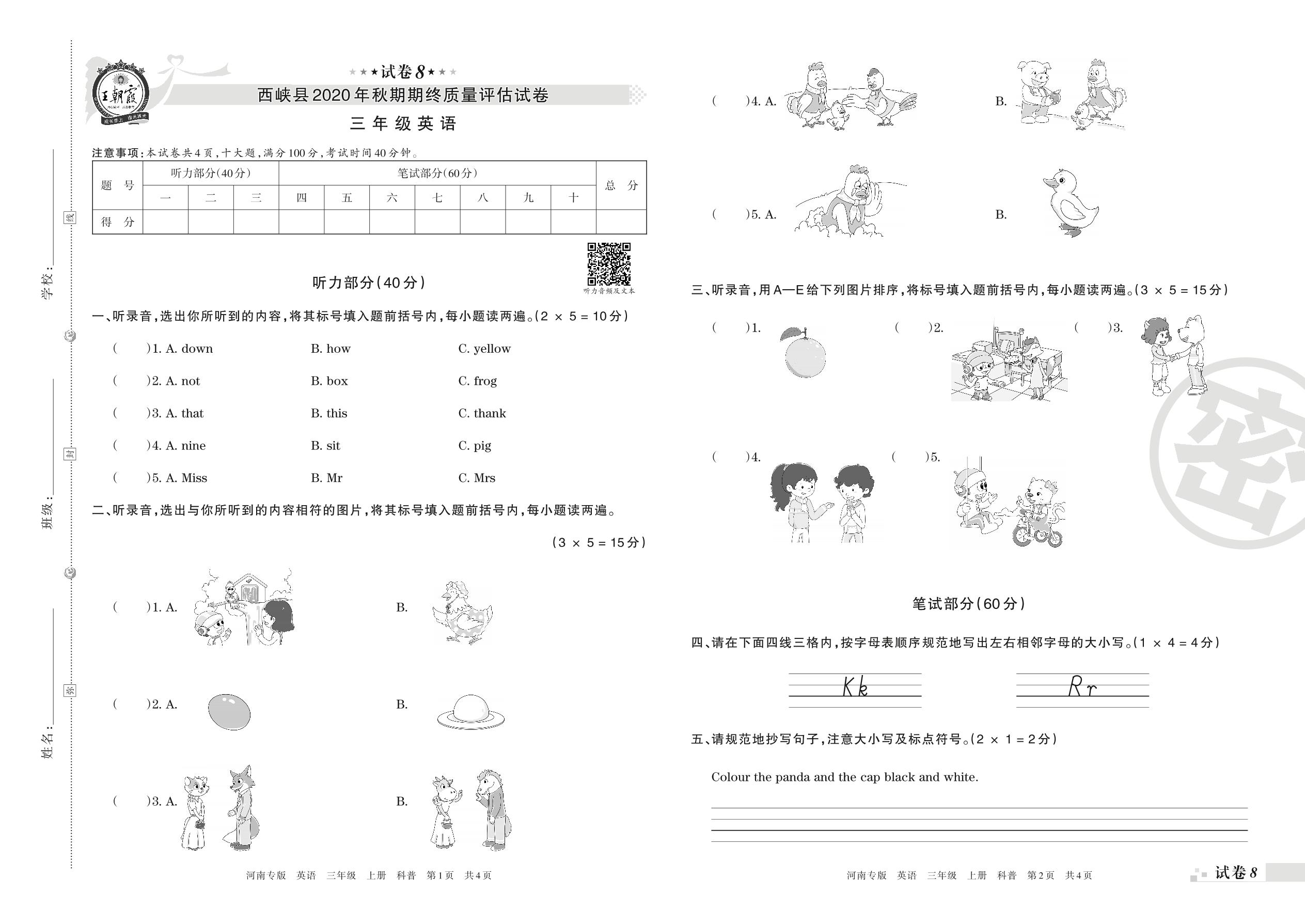 西峡县2020年秋期期终质量评估试卷三年级英语(科普版)【8】