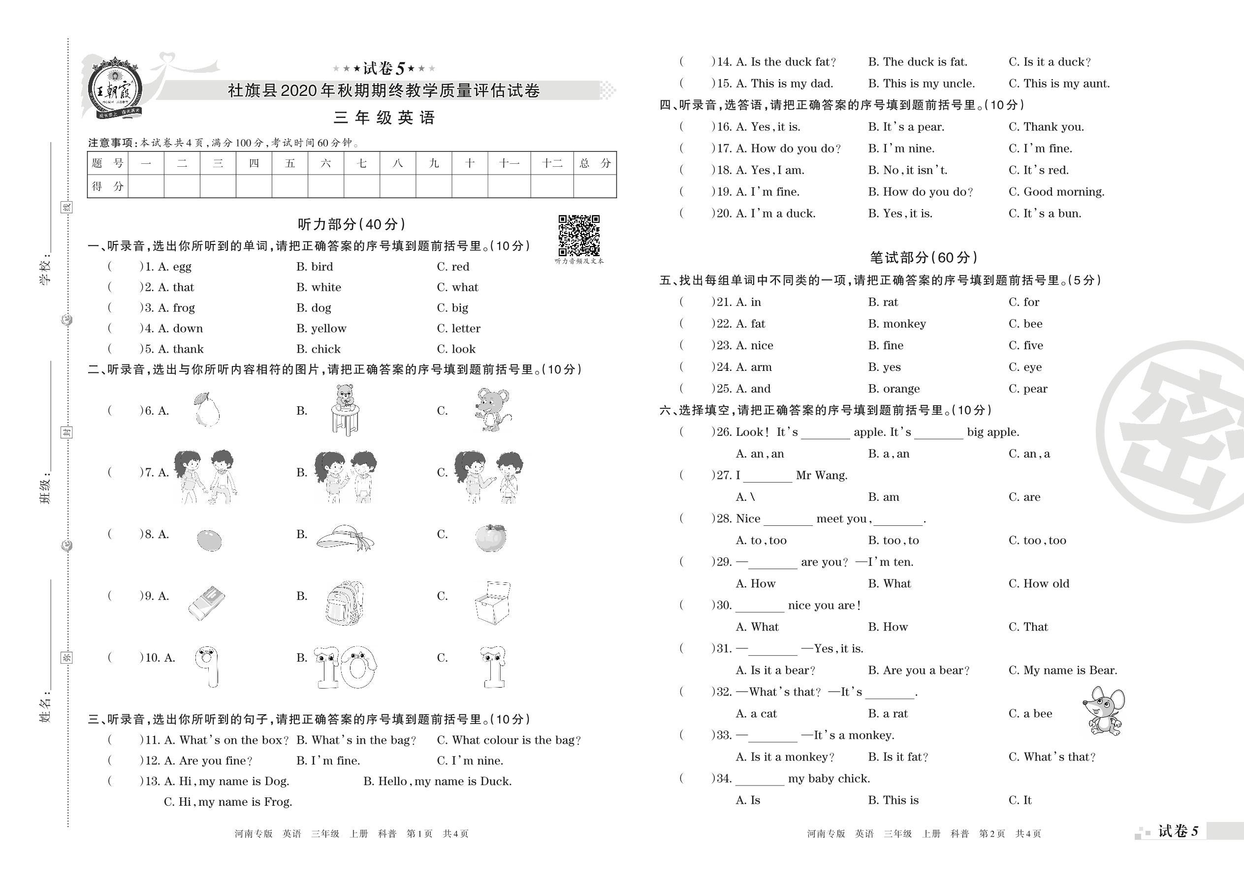 社旗县2020年秋期期终教学质量评估试卷三年级英语(科普版)【5】