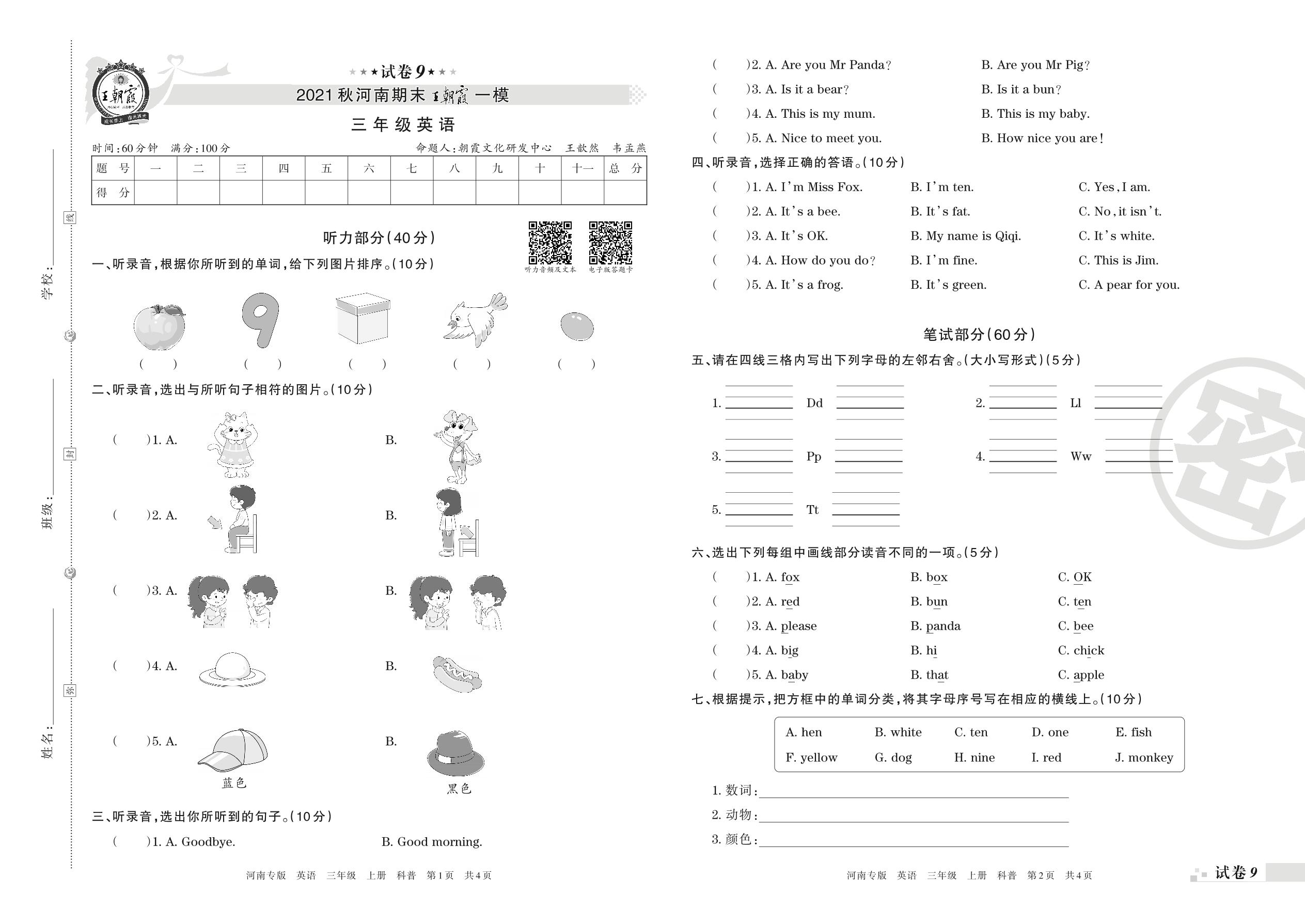 王朝霞期末模拟卷三年级上册英语(科普版)_R211225102055454【9】