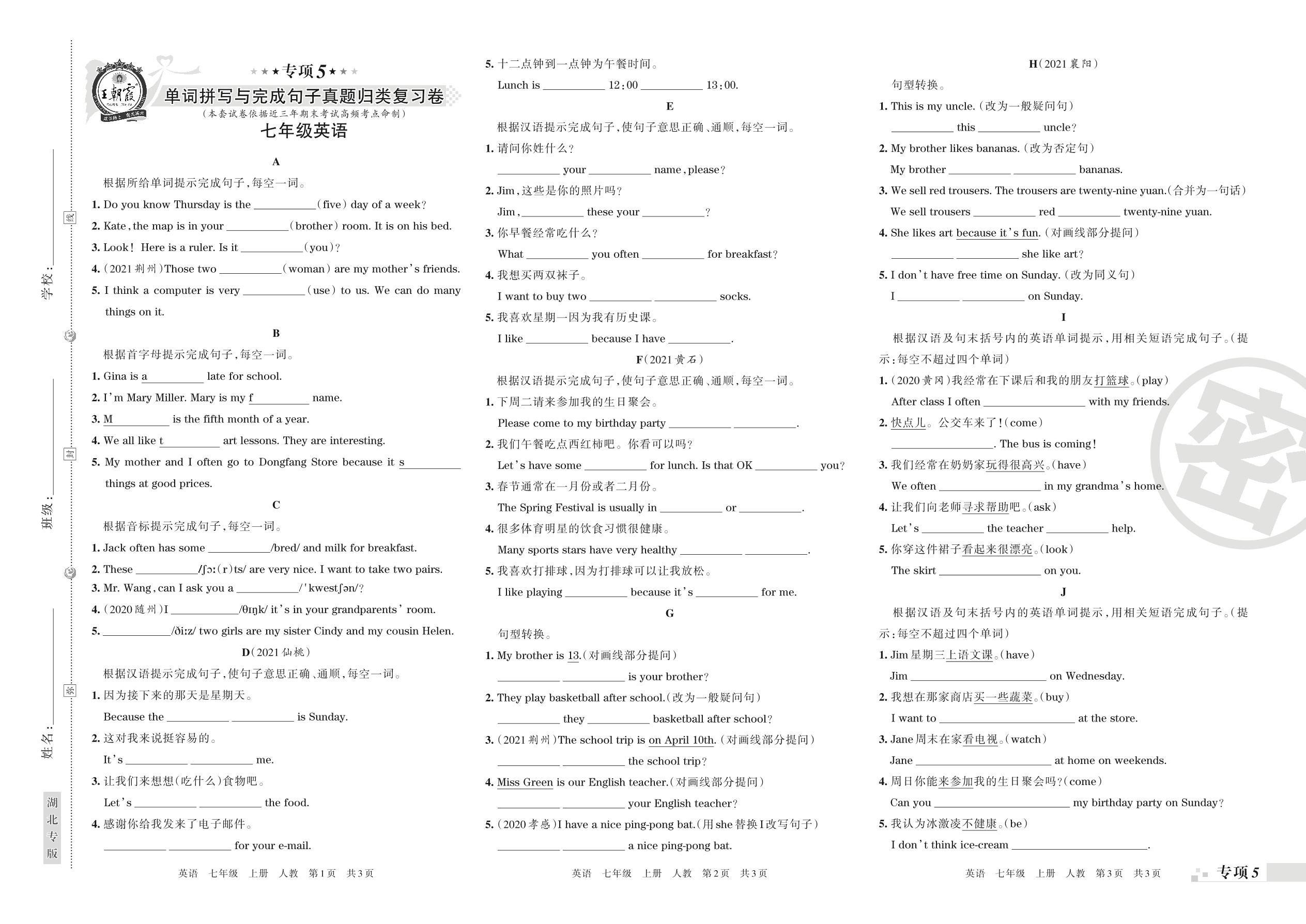 王朝霞期末专项卷——单词拼写与完成句子真题归类复习卷七年级上册英语(人教版)【5】