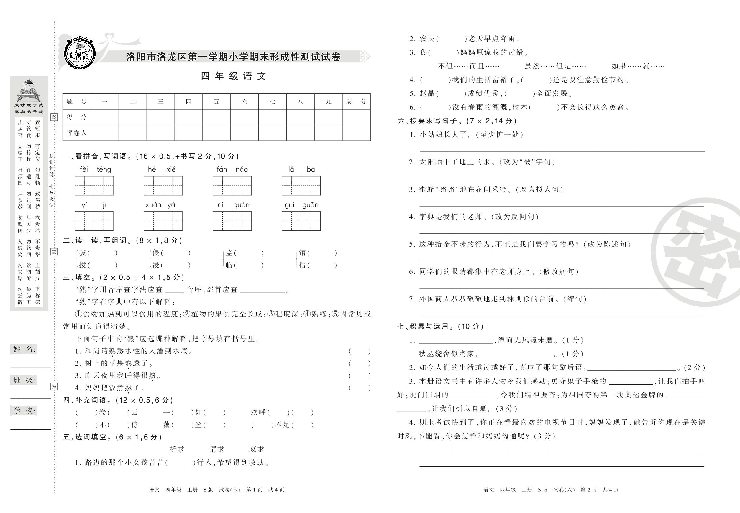 2016-2017学年第一学期洛阳市洛龙区四年级语文试卷(S版)【6】
