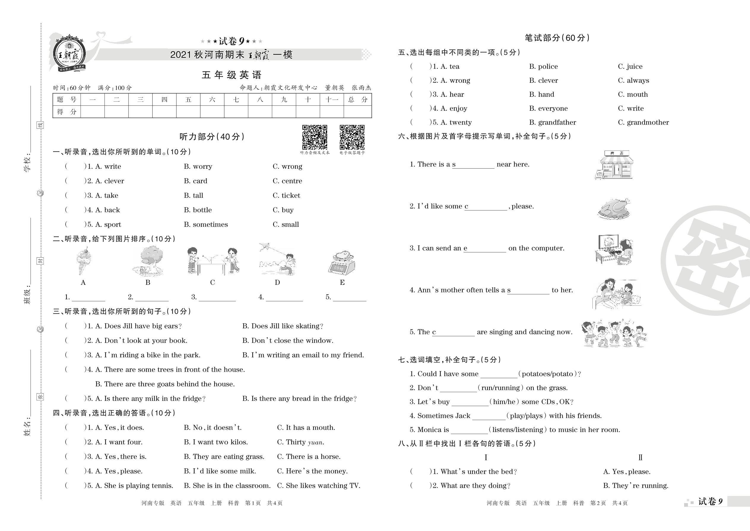 王朝霞期末模拟卷五年级上册英语(科普版)_R211225102928348【9】