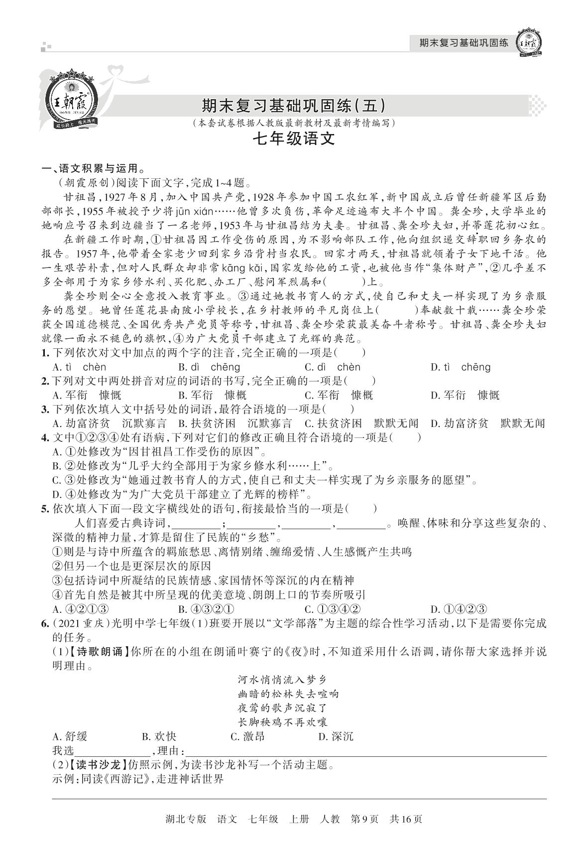 王朝霞期末小卷——期末复习基础巩固练(五)七年级上册语文(人教版)_R211225103030276【5】
