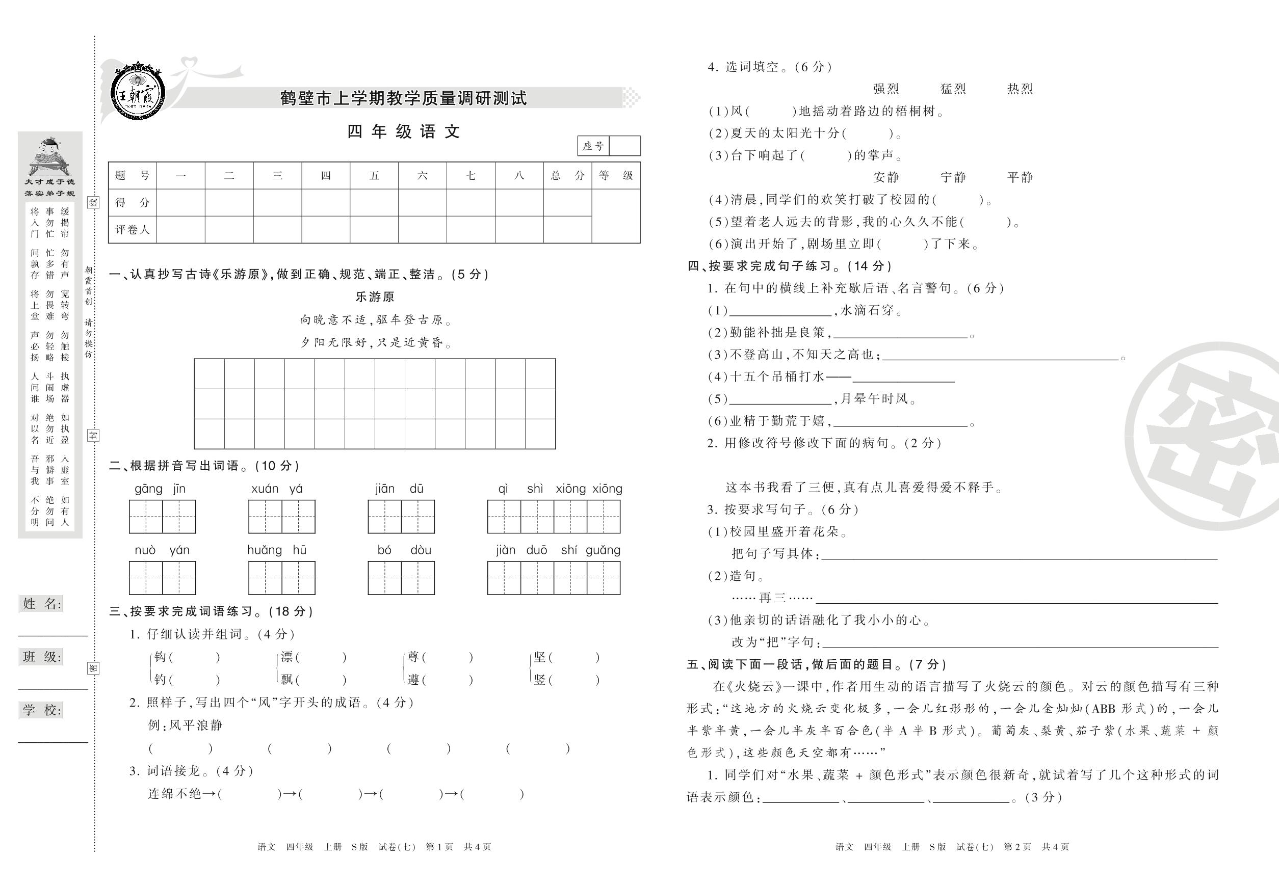 2016-2017学年第一学期鹤壁市四年级语文试卷(S版)【7】