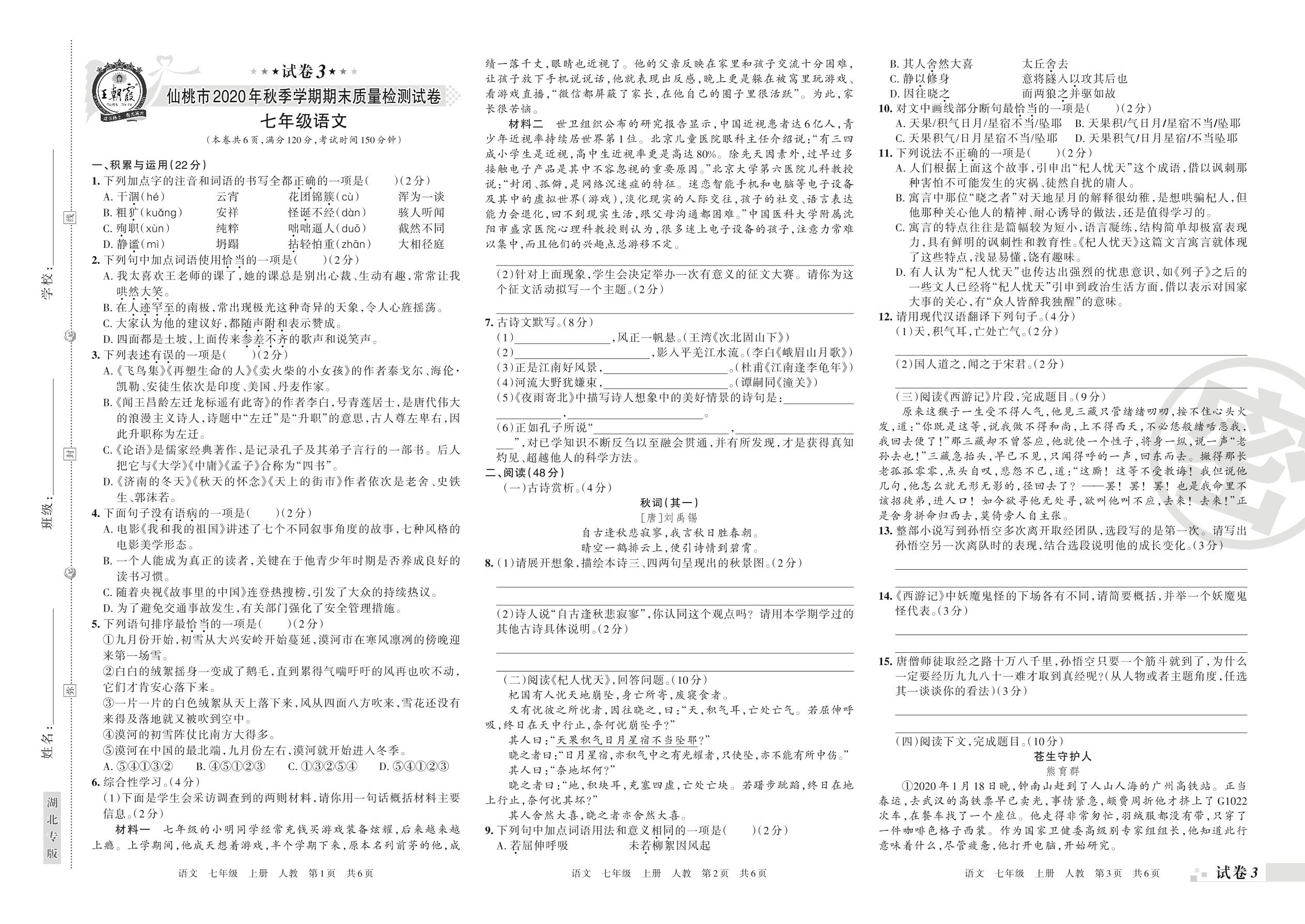 仙桃市2020年秋季学期期末质量检测试卷七年级语文(人教版)【3】