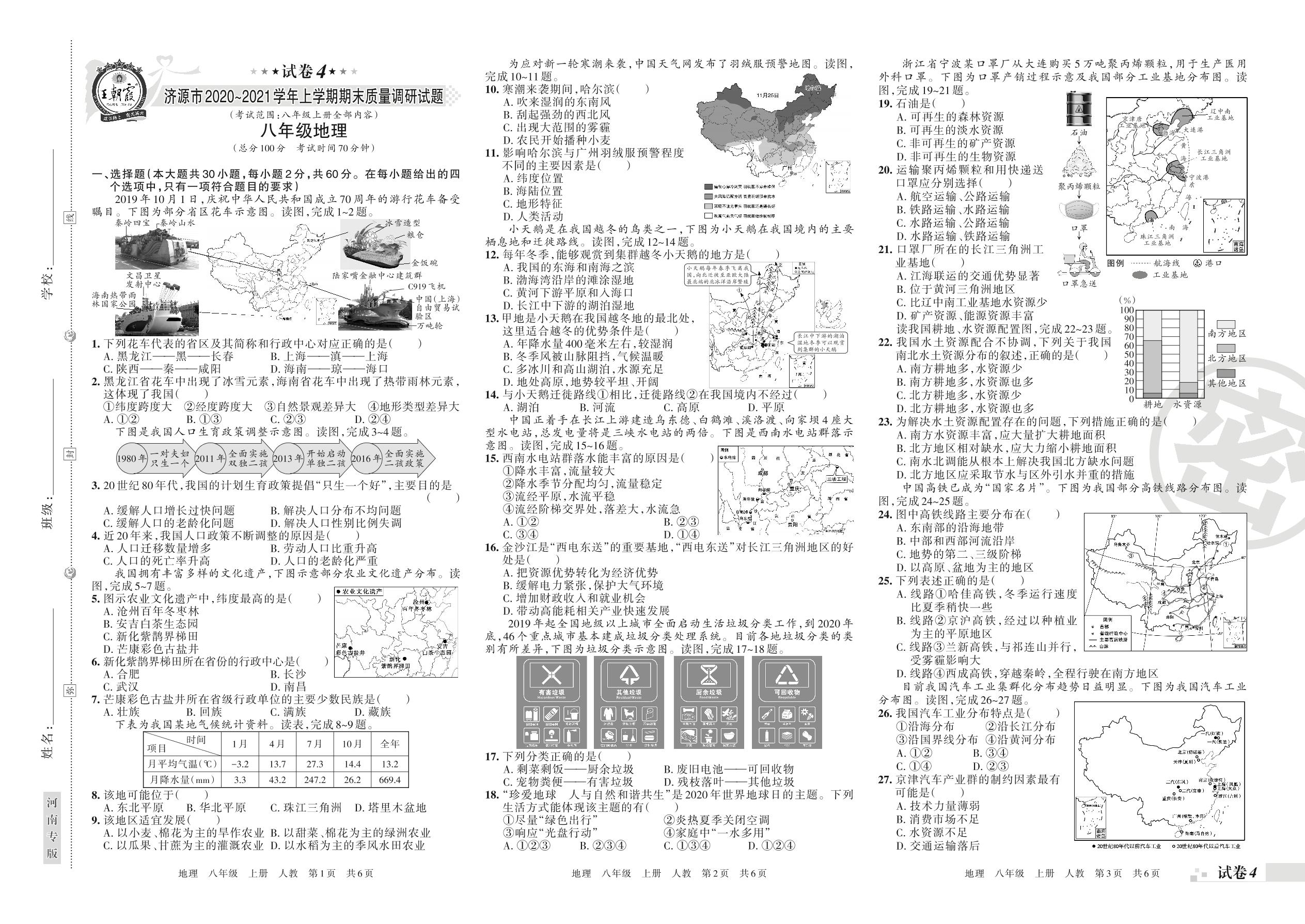 济源市2020~2021学年上学期期末质量调研试题八年级地理(人教版)【4】
