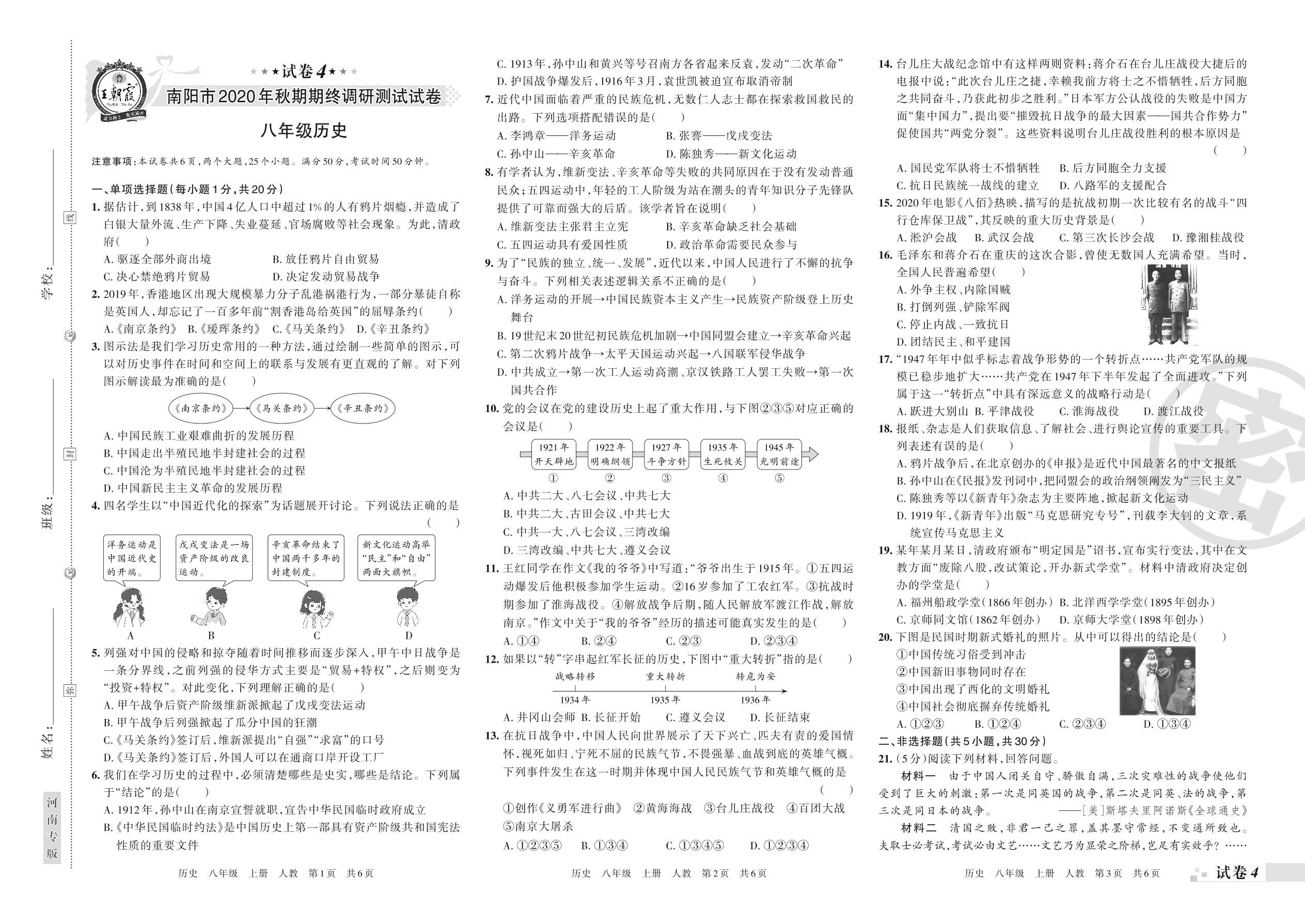 南阳市2020年秋期期终调研测试试卷八年级历史(人教版)【4】