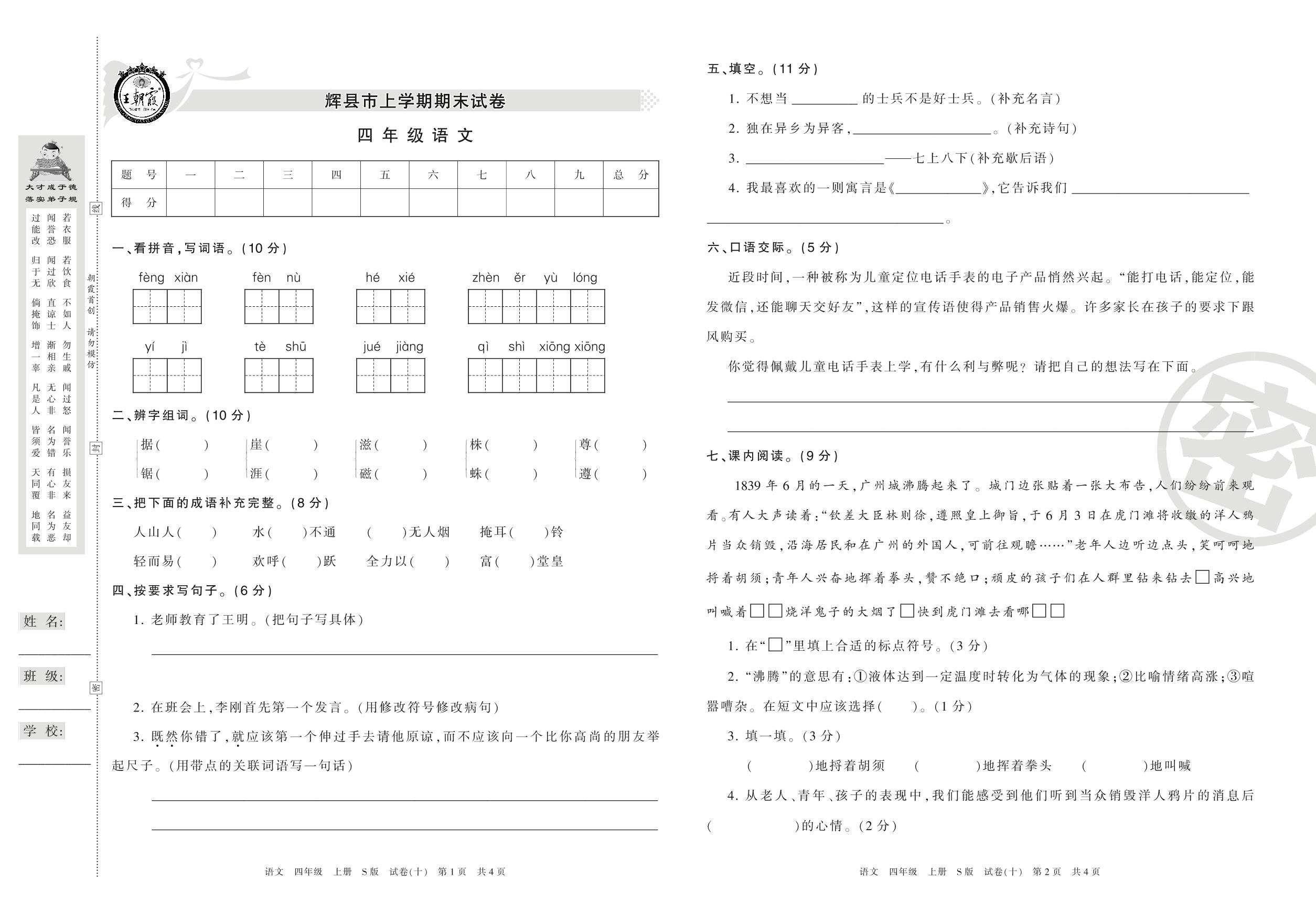 2016-2017学年第一学期辉县市四年级语文试卷(S版)【10】