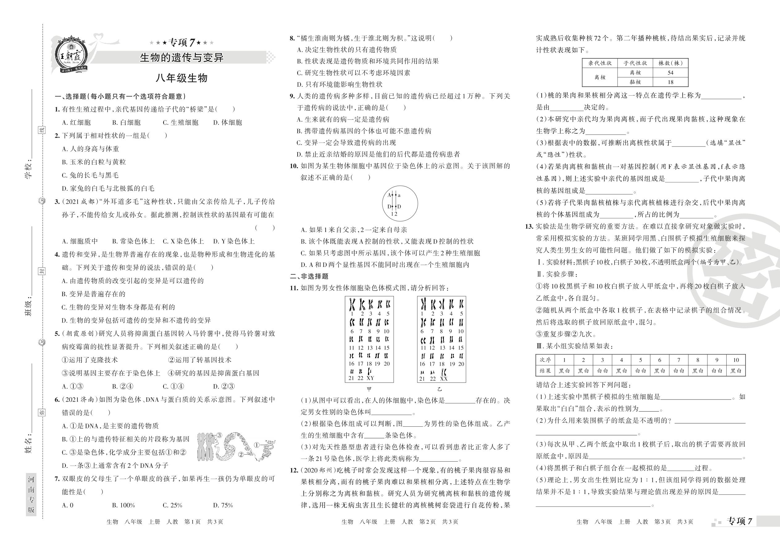 王朝霞期末专项卷——生物的遗传与变异八年级上册生物(人教版)【7】