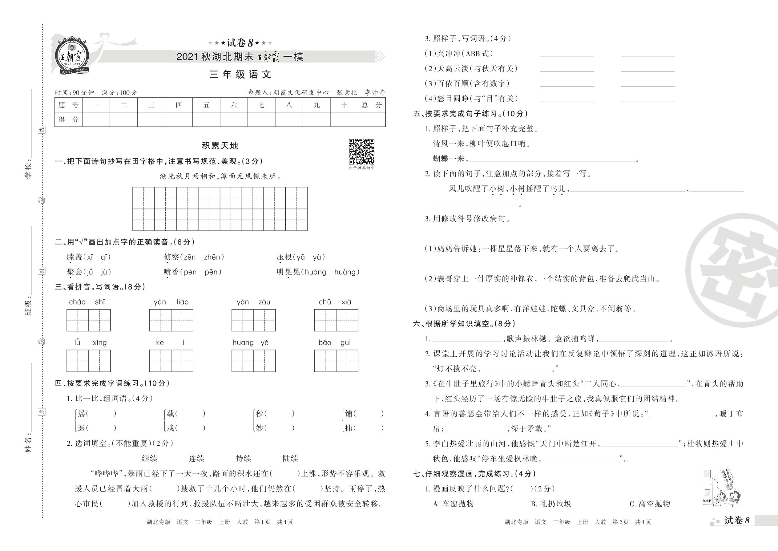 王朝霞期末模拟卷三年级上册语文(人教版)_R211225105715536【8】