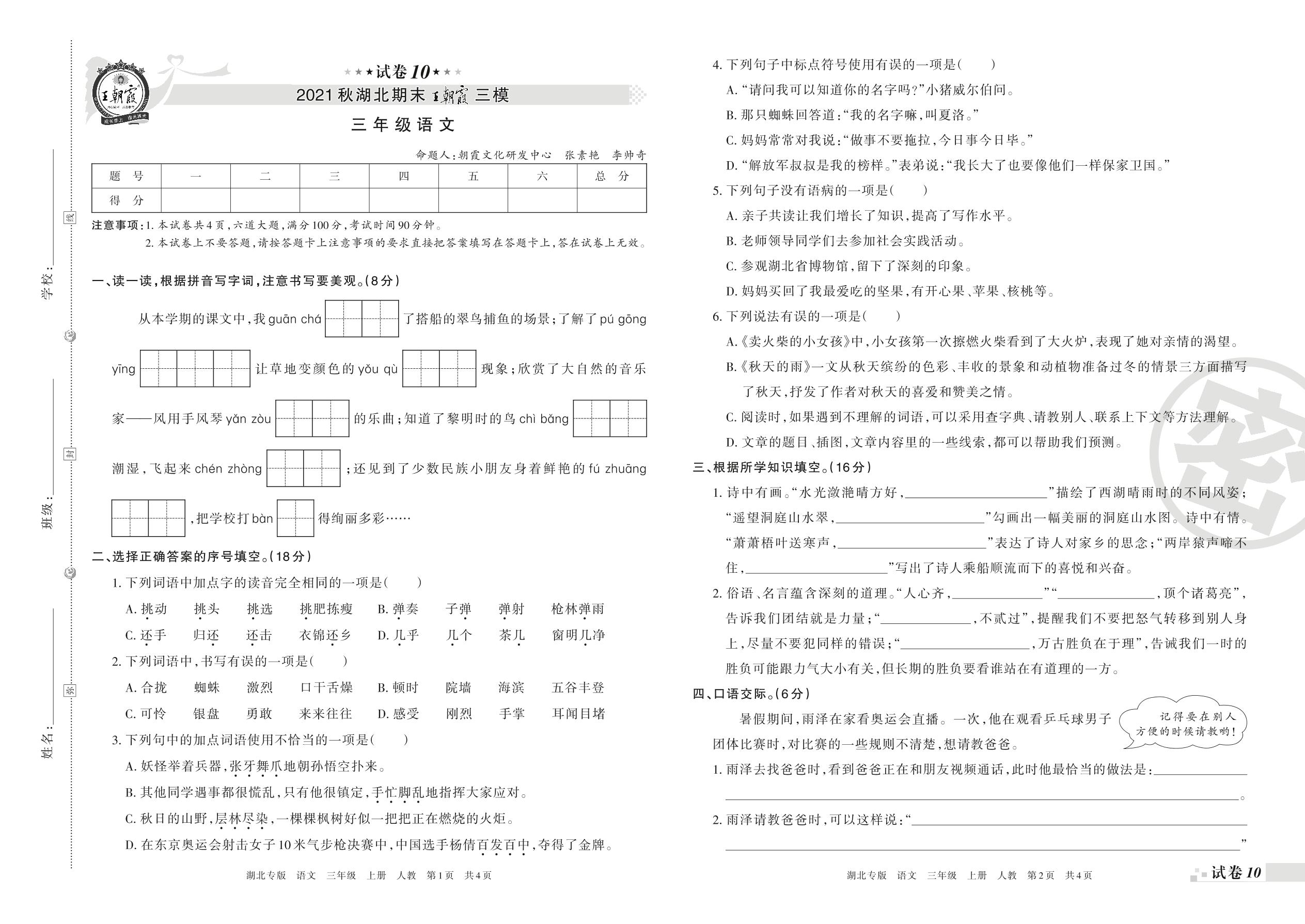 王朝霞期末模拟卷三年级上册语文(人教版)_R211225105715277【10】
