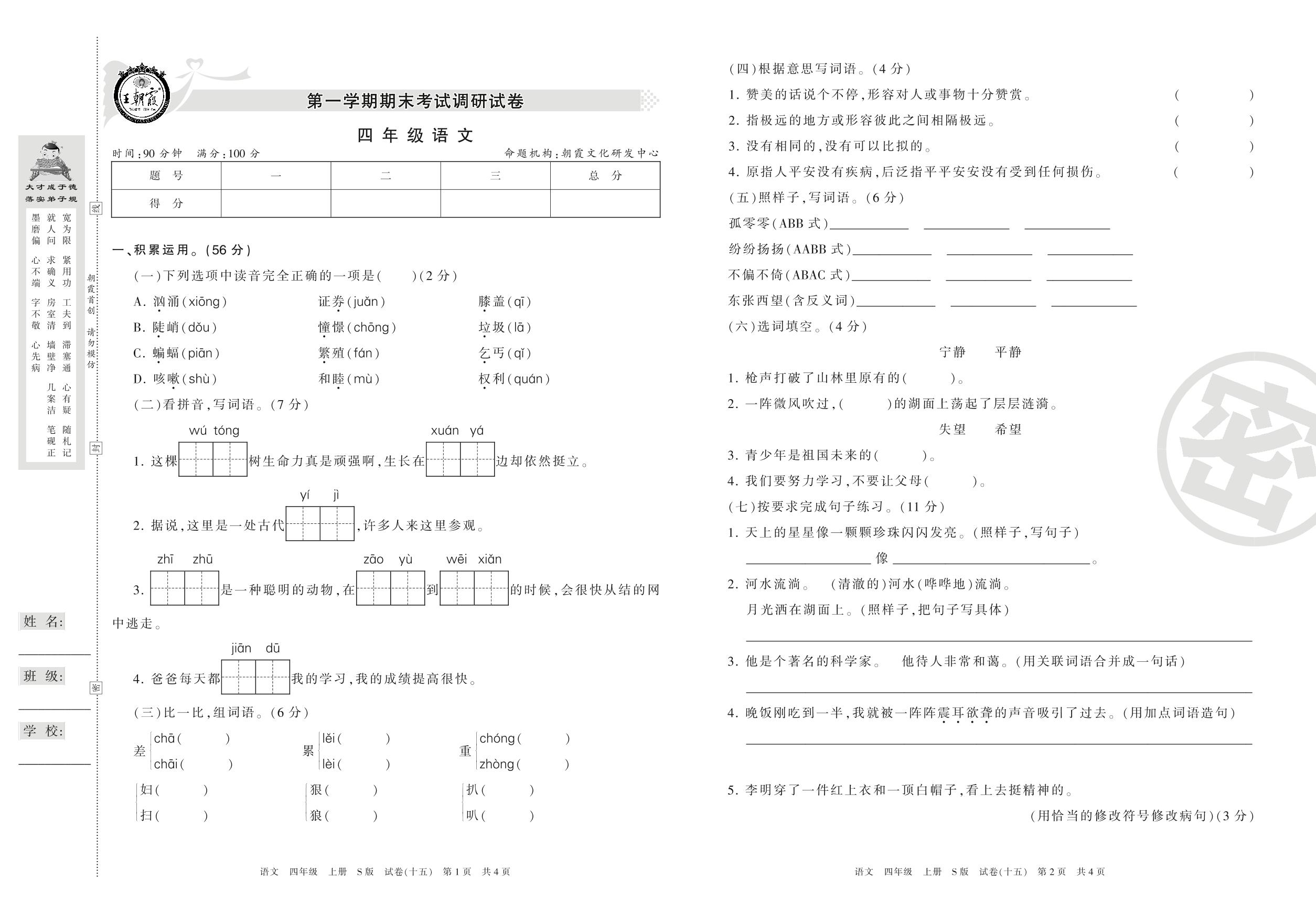 王朝霞期末调研卷四年级上册语文(S版)【15】