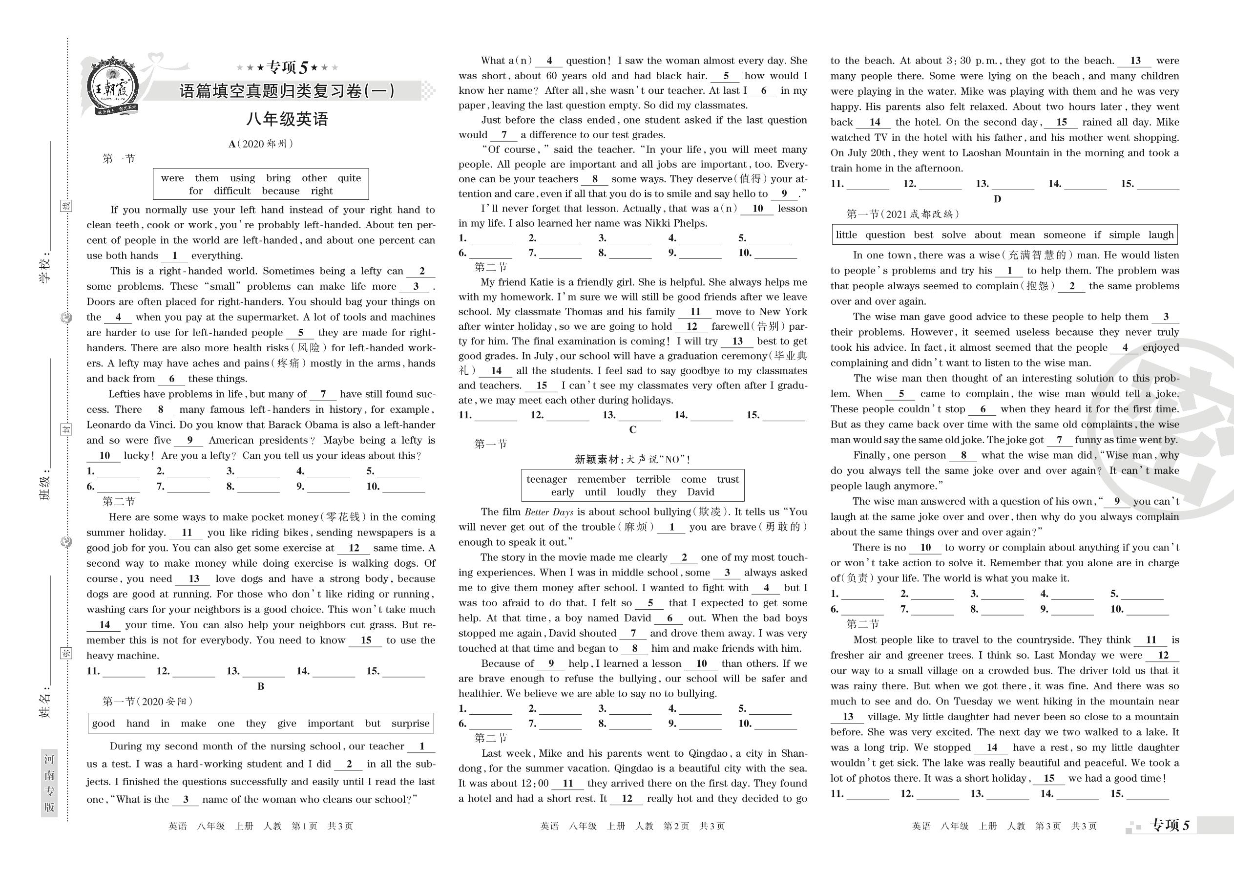 王朝霞期末专项卷——语篇填空真题归类复习卷(一)八年级上册英语(人教版)_R211225110542702【5】