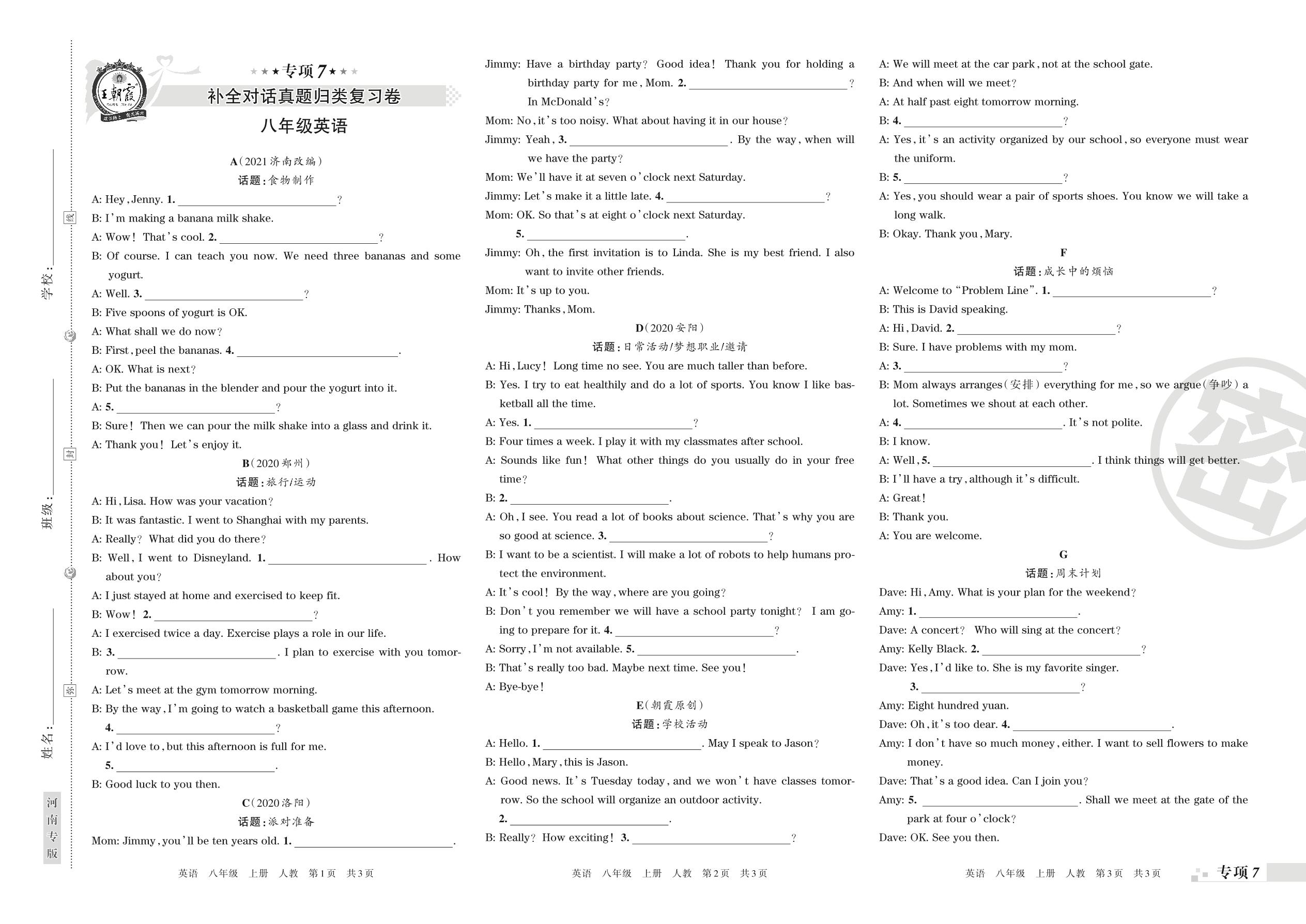王朝霞期末专项卷——补全对话真题归类复习卷八年级上册英语(人教版)_R211225110542671【7】