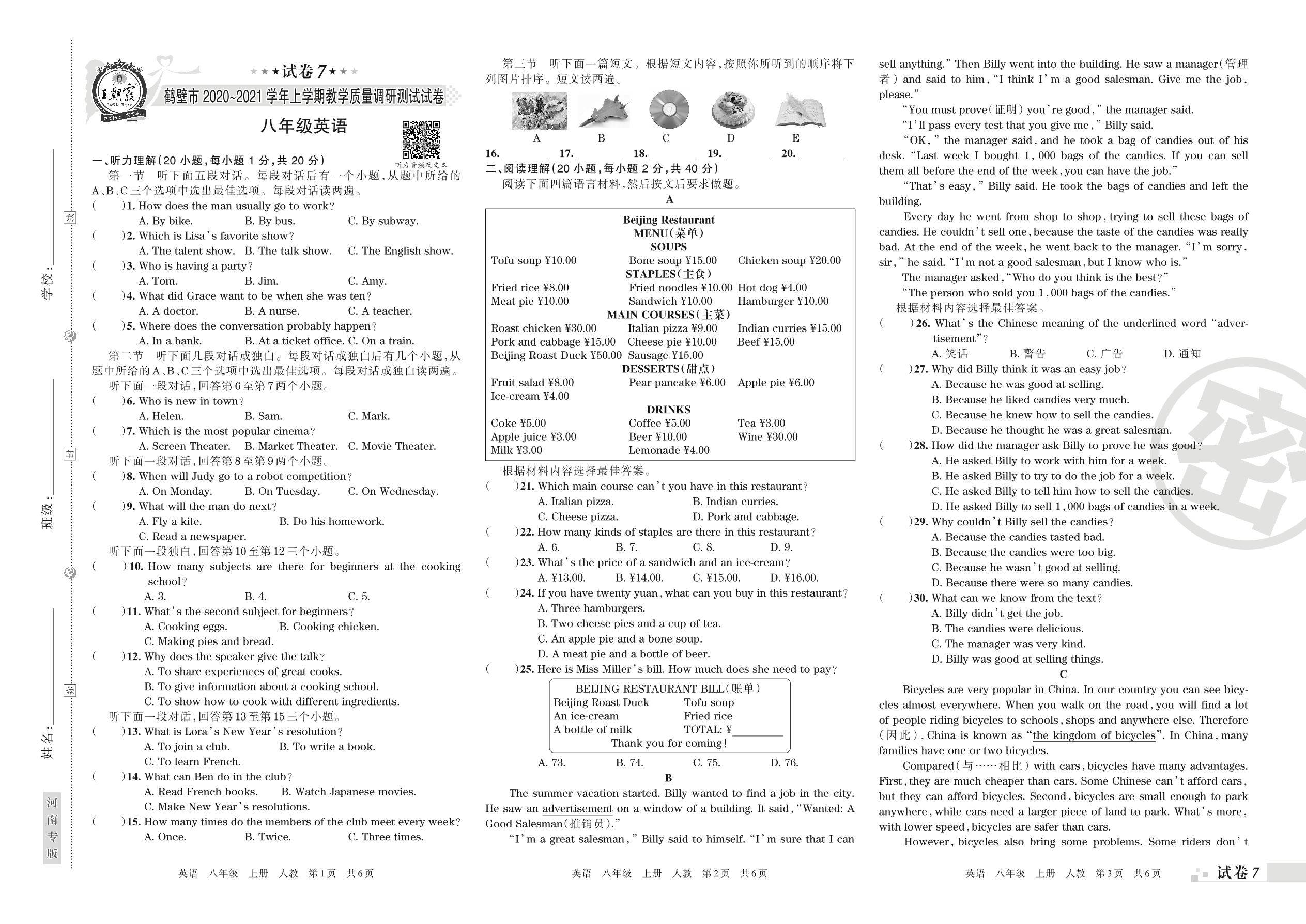 鹤壁市 2020~2021 学年上学期教学质量调研测试试卷八年级英语(人教版)【7】