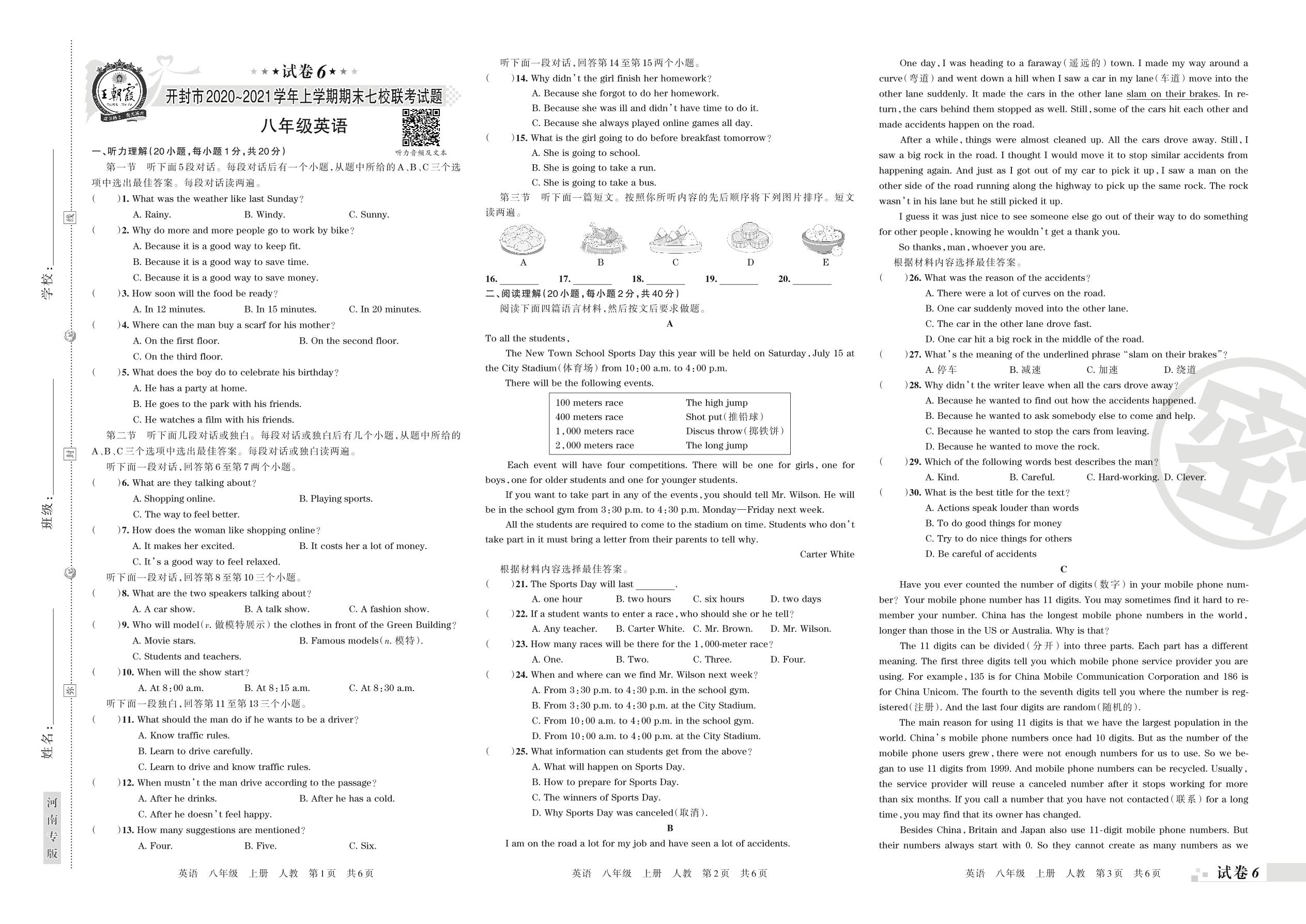 开封市2020~2021学年上学期期末七校联考试题八年级英语(人教版)【6】