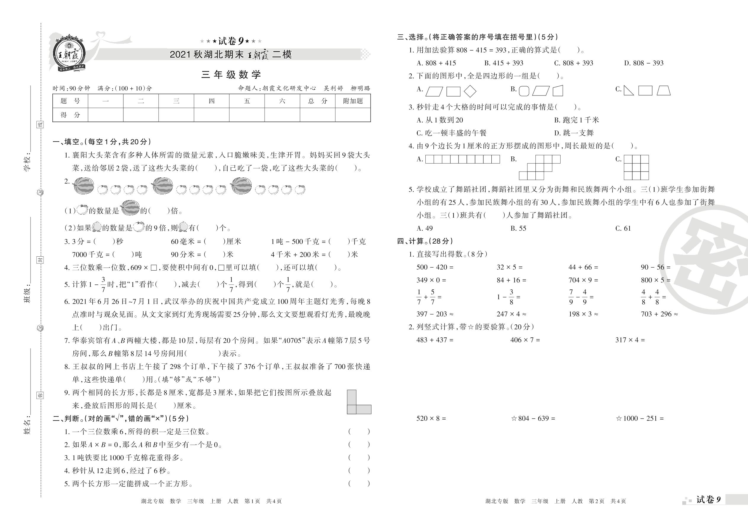 王朝霞期末模拟卷三年级上册数学人教版【9】