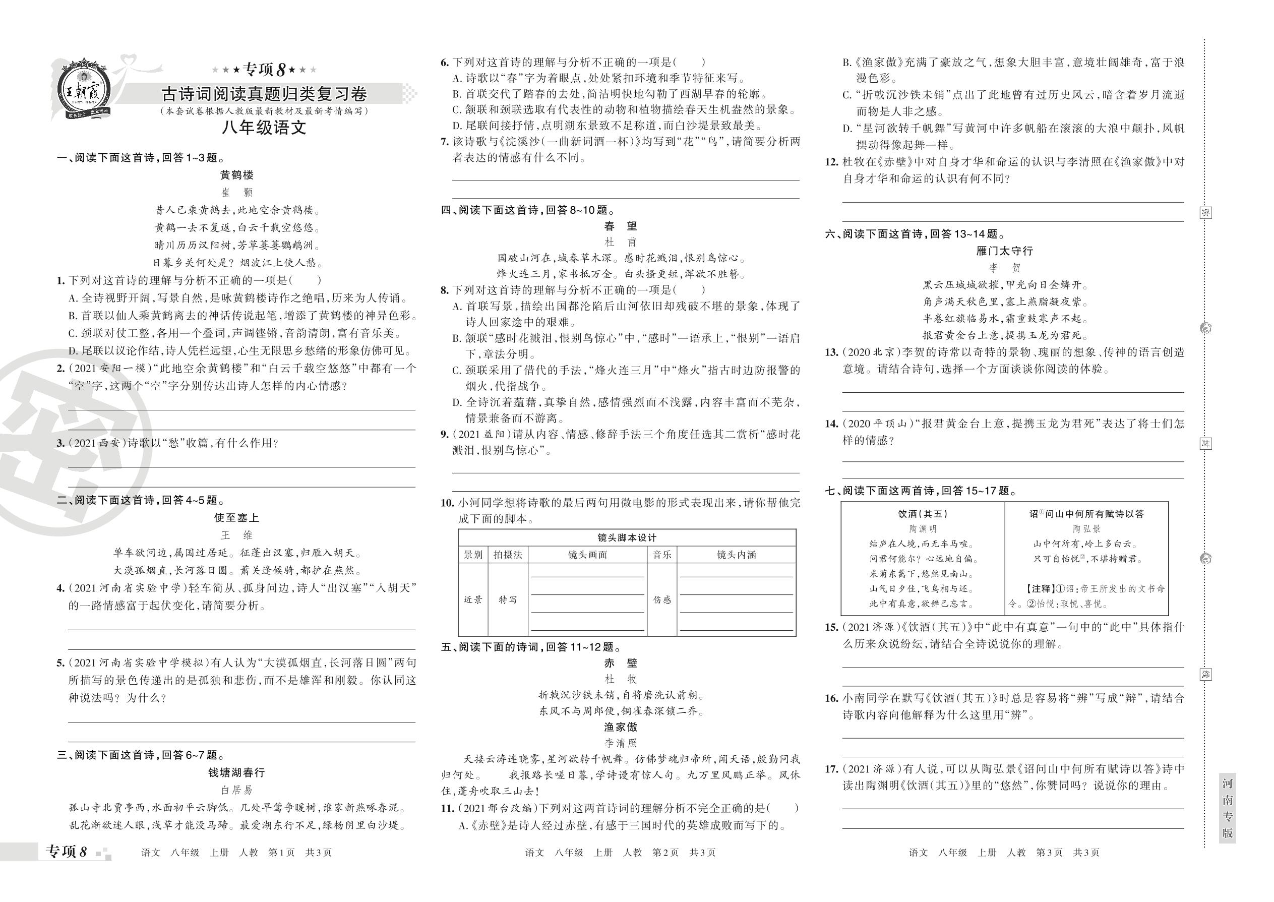 王朝霞期末专项卷——古诗词阅读真题归类复习卷八年级上册语文(人教版)_R211225111039364【8】