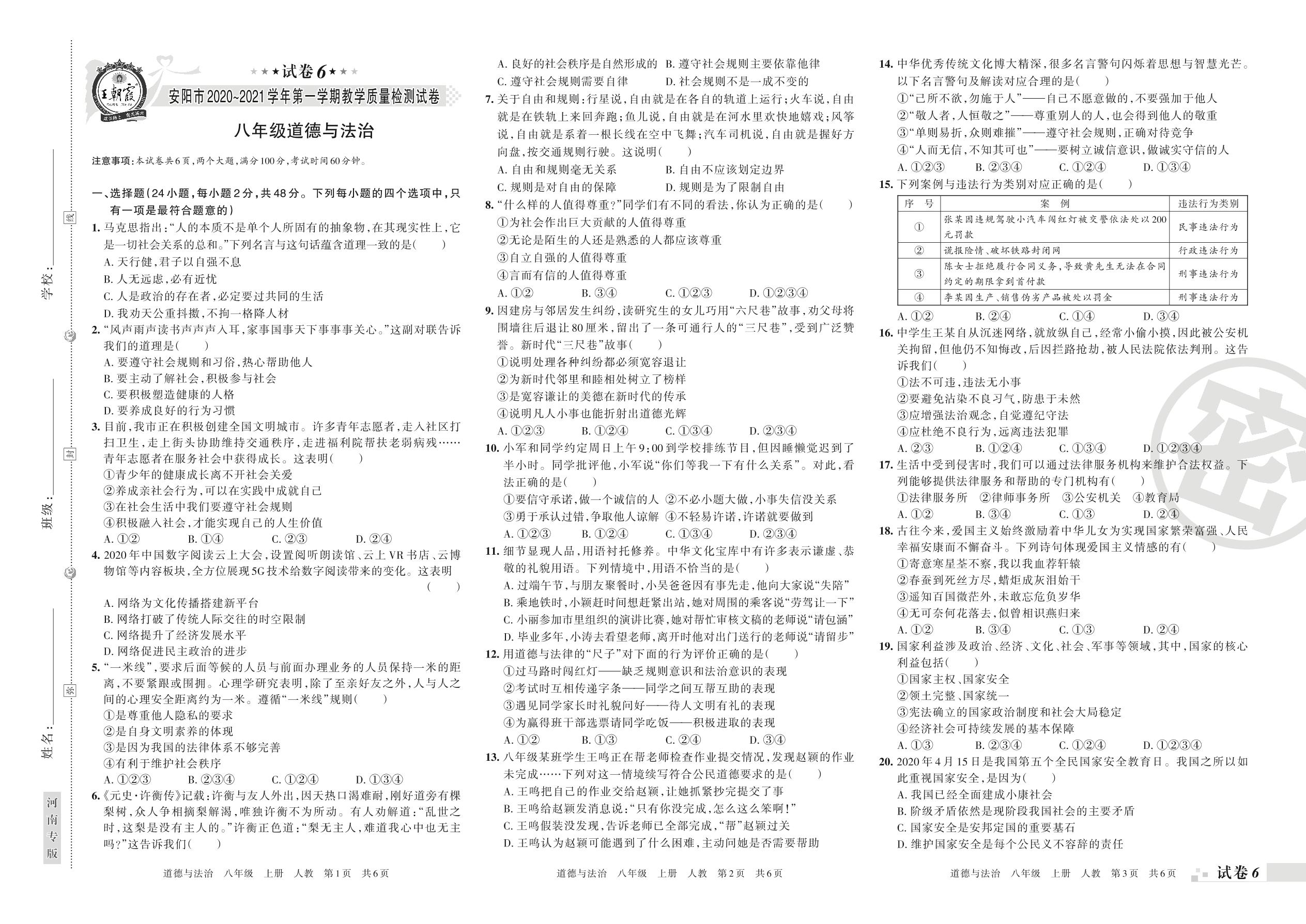 安阳市2020~2021学年第一学期教学质量检测试卷八年级道德与法治(人教版)【6】