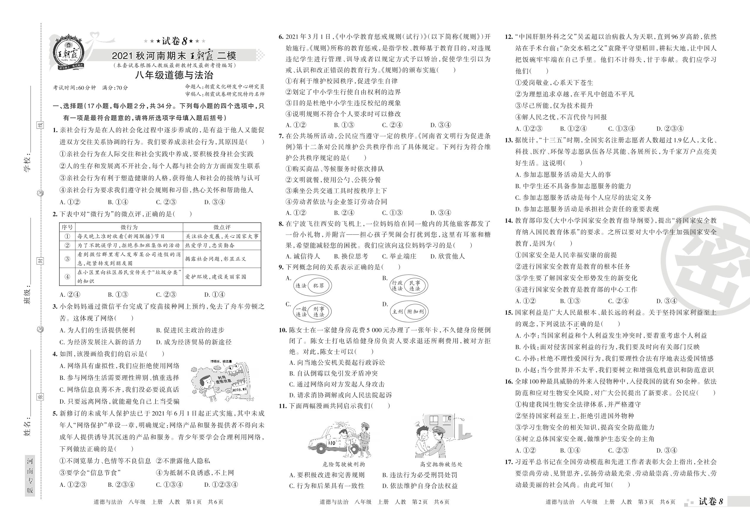 王朝霞期末模拟卷八年级上册道德与法治(人教版)_R211225111407014【8】