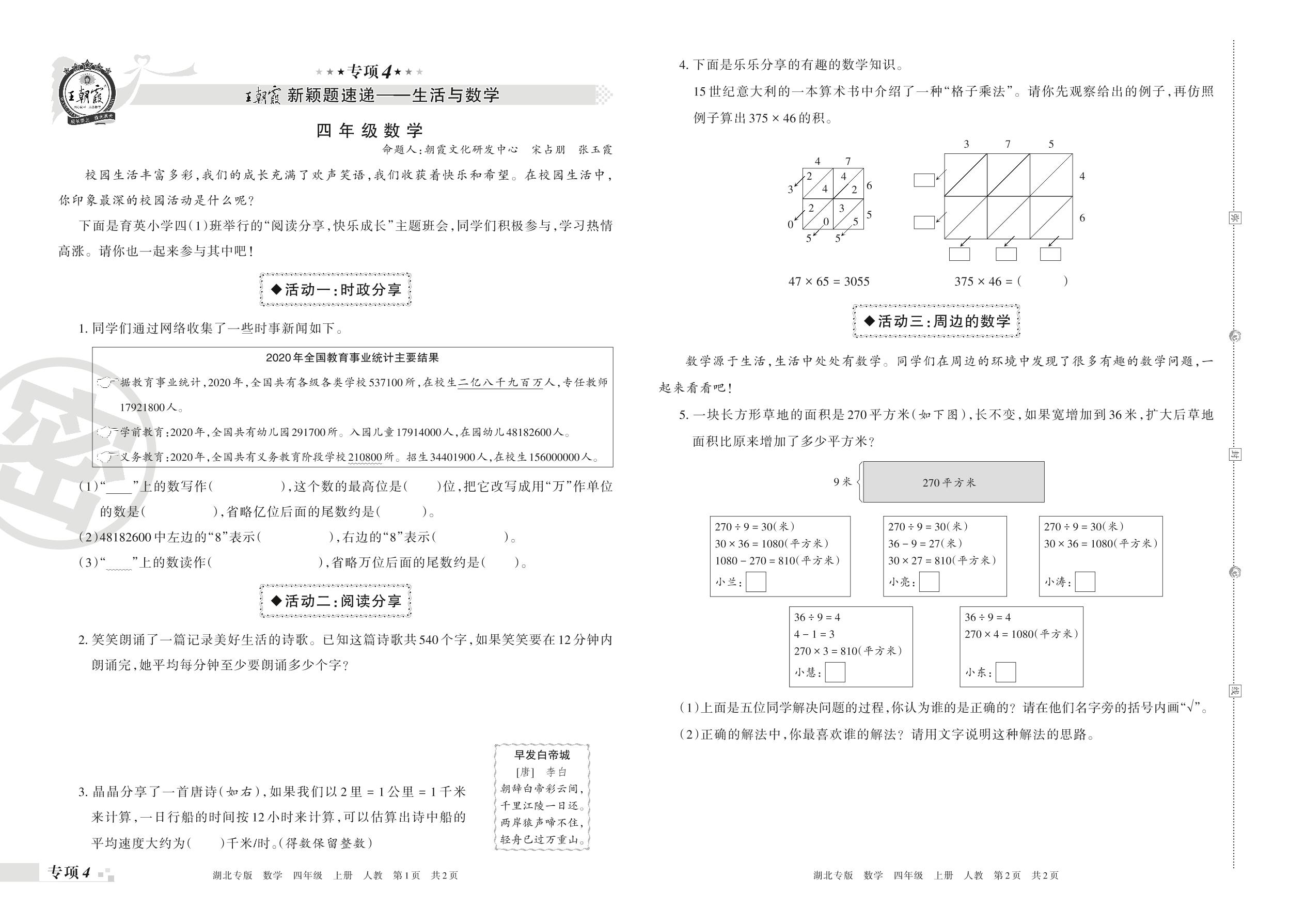 王朝霞期末专项卷——新颖题速递:生活与数学四年级上册数学人教版【4】