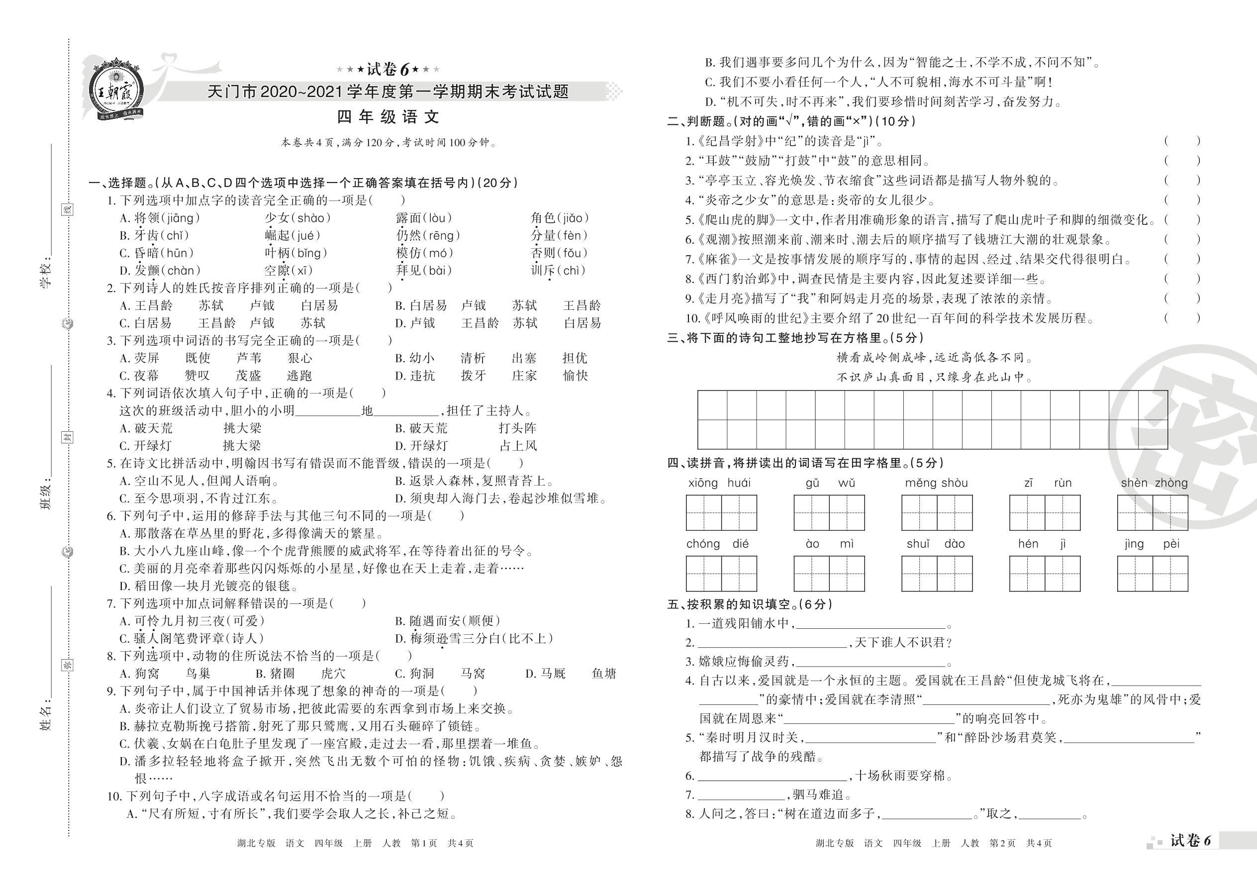 天门市2020~2021学年度第一学期期末考试试题四年级语文(人教版)【6】