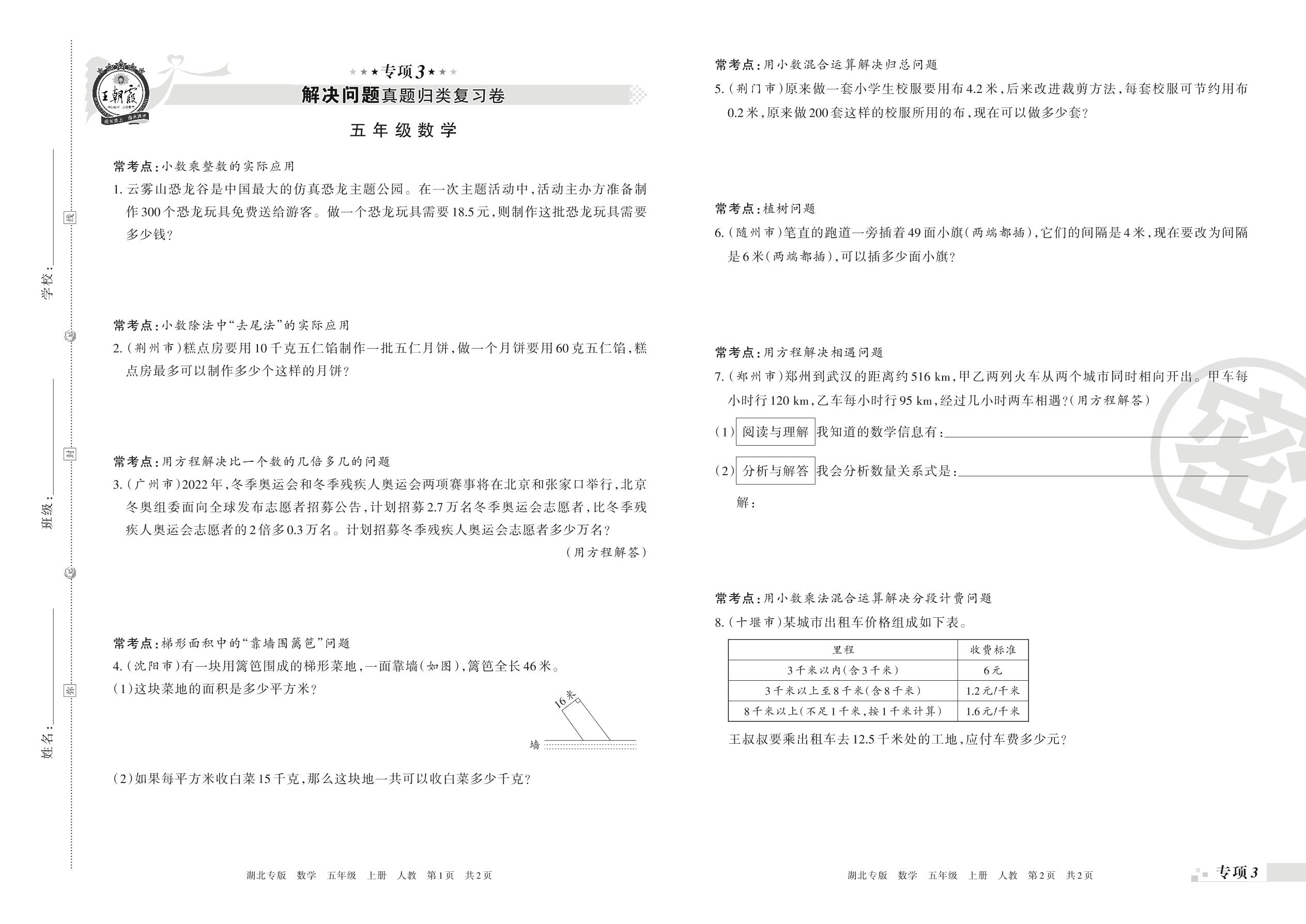王朝霞期末专项卷——解决问题真题归类复习卷五年级上册数学人教版【3】