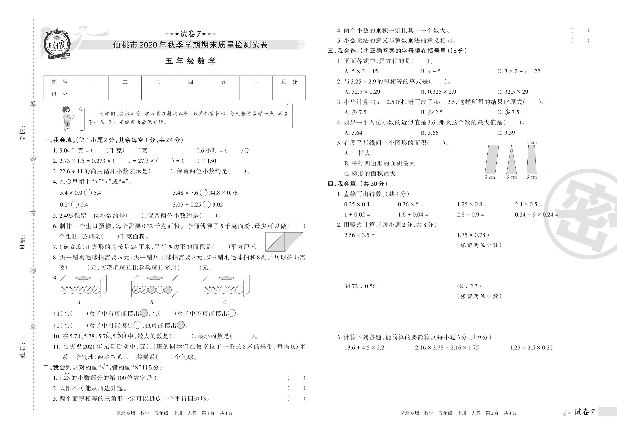 仙桃市2020年秋季学期期末质量检测试卷五年级数学人教版【7】