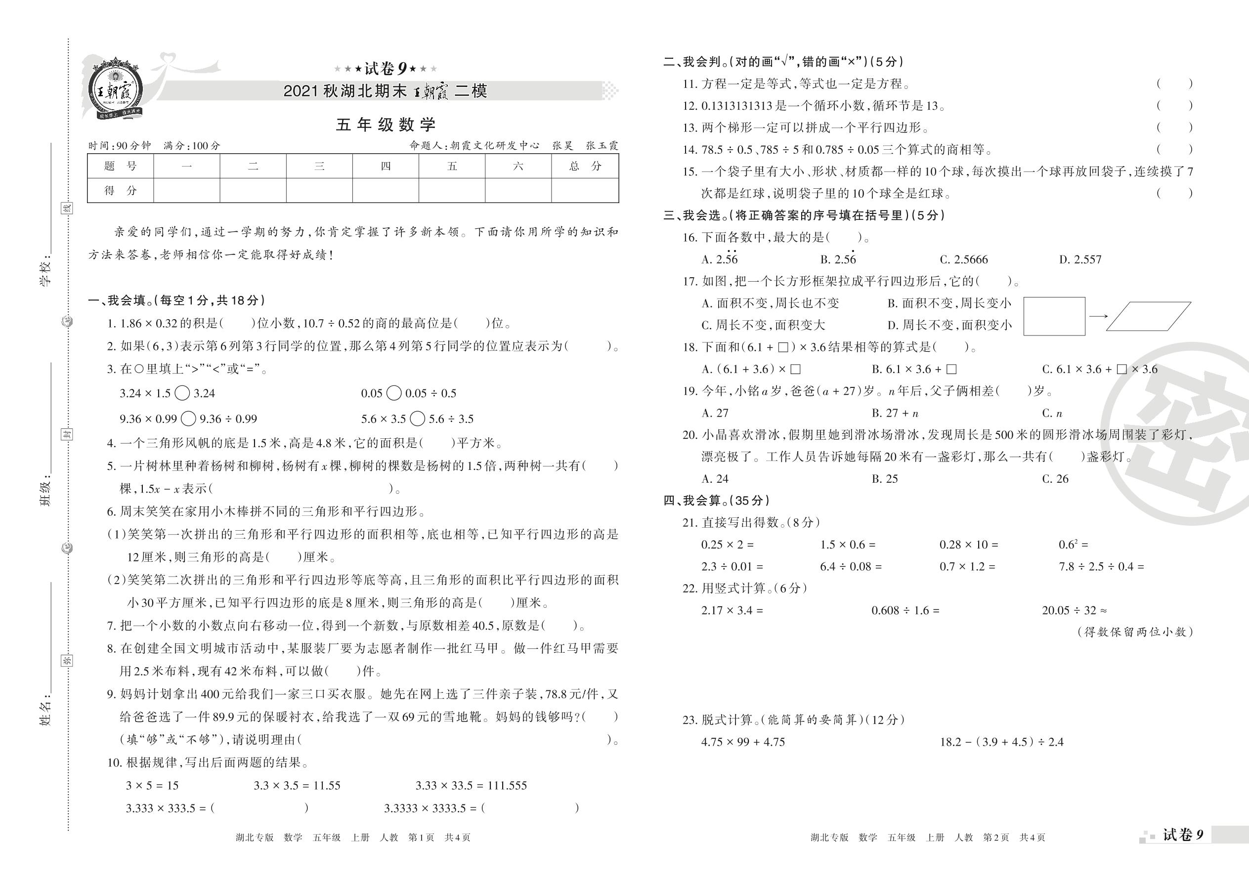 王朝霞期末模拟卷五年级上册数学人教版【9】