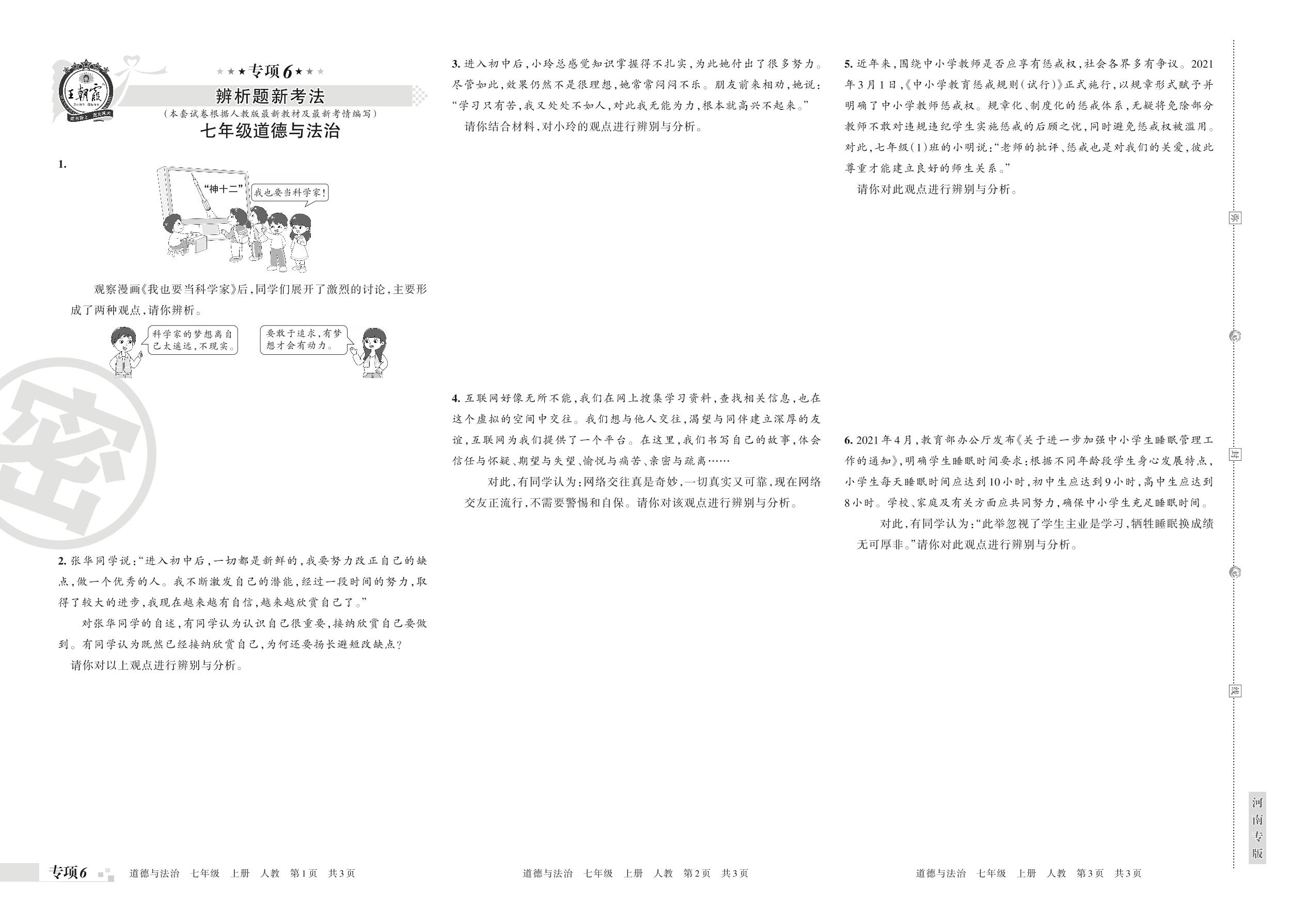 王朝霞期末专项卷——辨析题新考法七年级上册道德与法治(人教版)【6】
