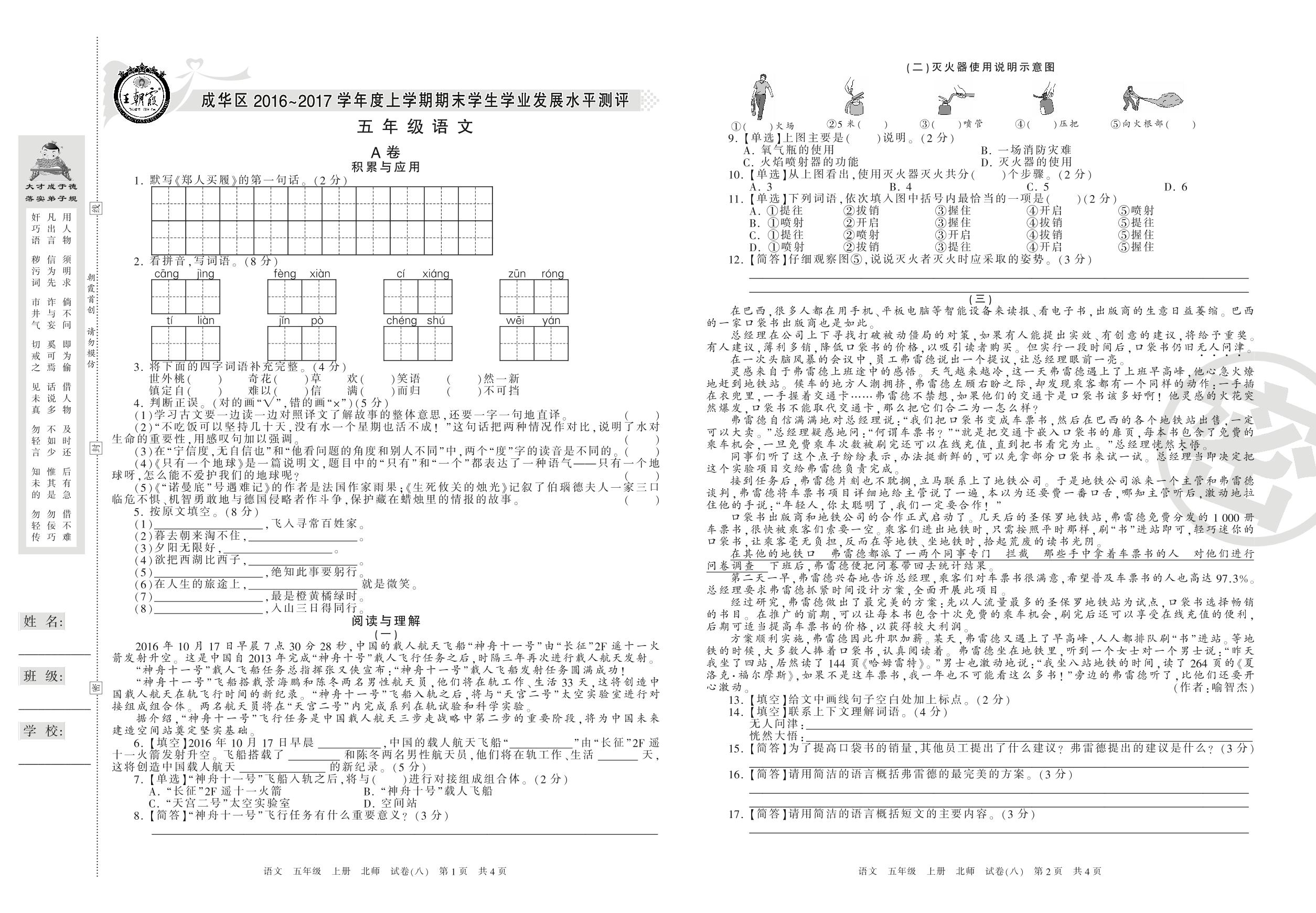 2016-2017学年第一学期成都市成华区五年级语文试卷(北师版)【8】